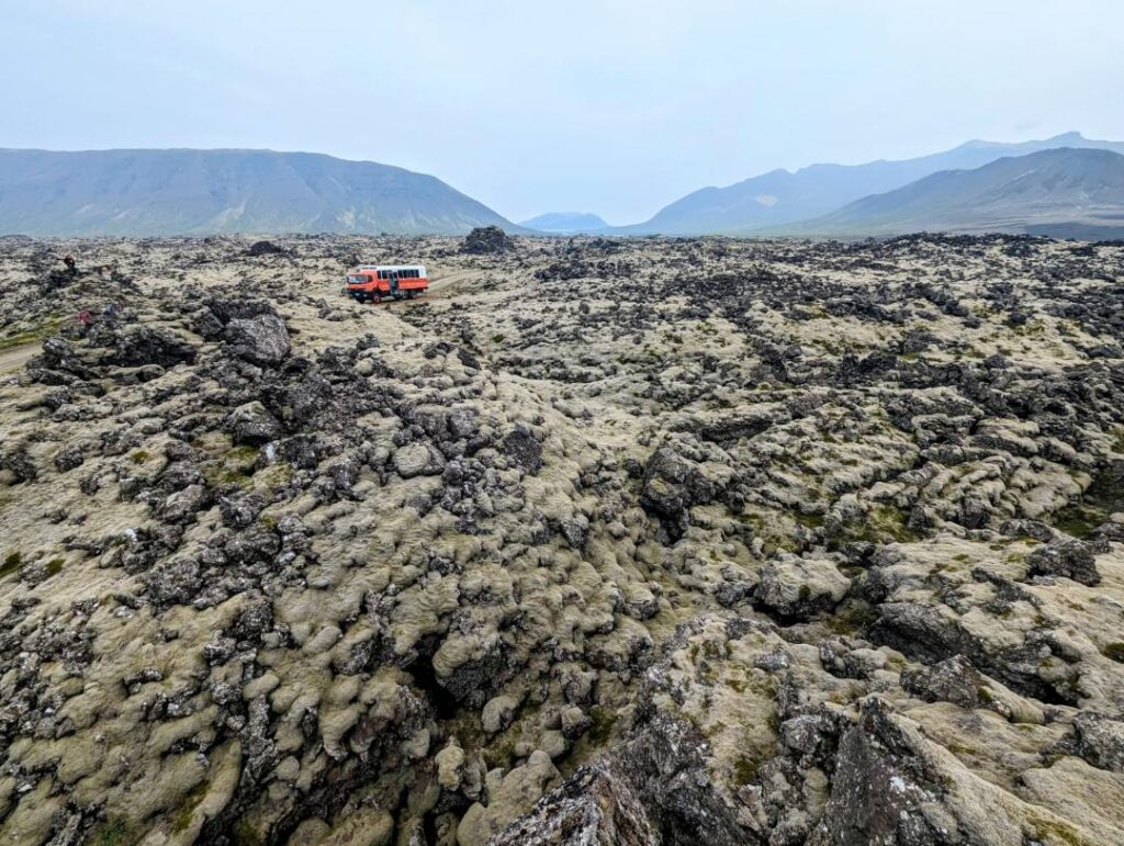 Finally we drove through some lava fields and stopped for photos. After the lava cools first comes the lichen then the moss. Several centuries later they look like these.