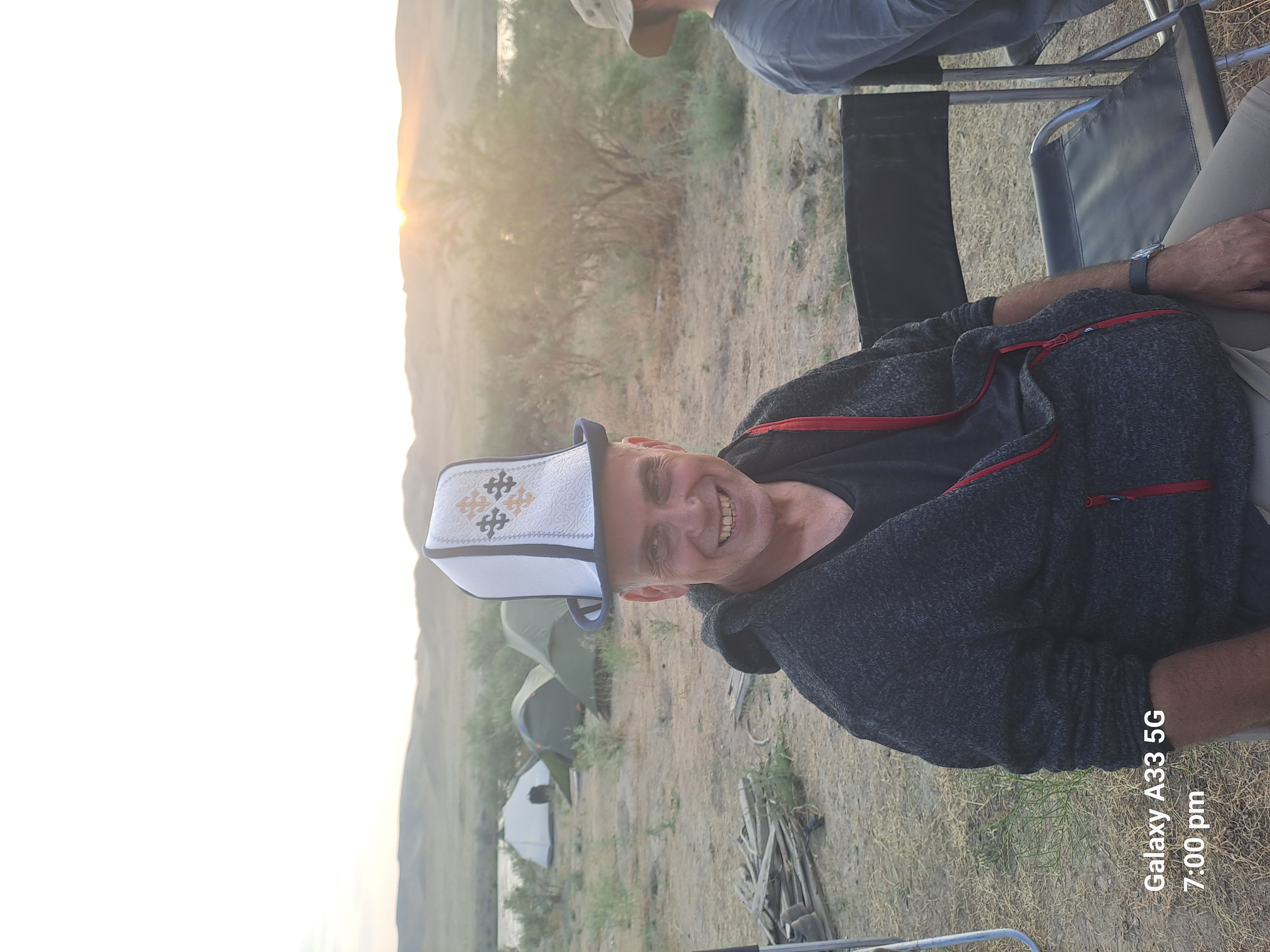 After being told about how the hats identify a person’s home area while in Bukhara, we had been seeing men wearing them more, so Ashley had to have a go while we were around the camp fire.