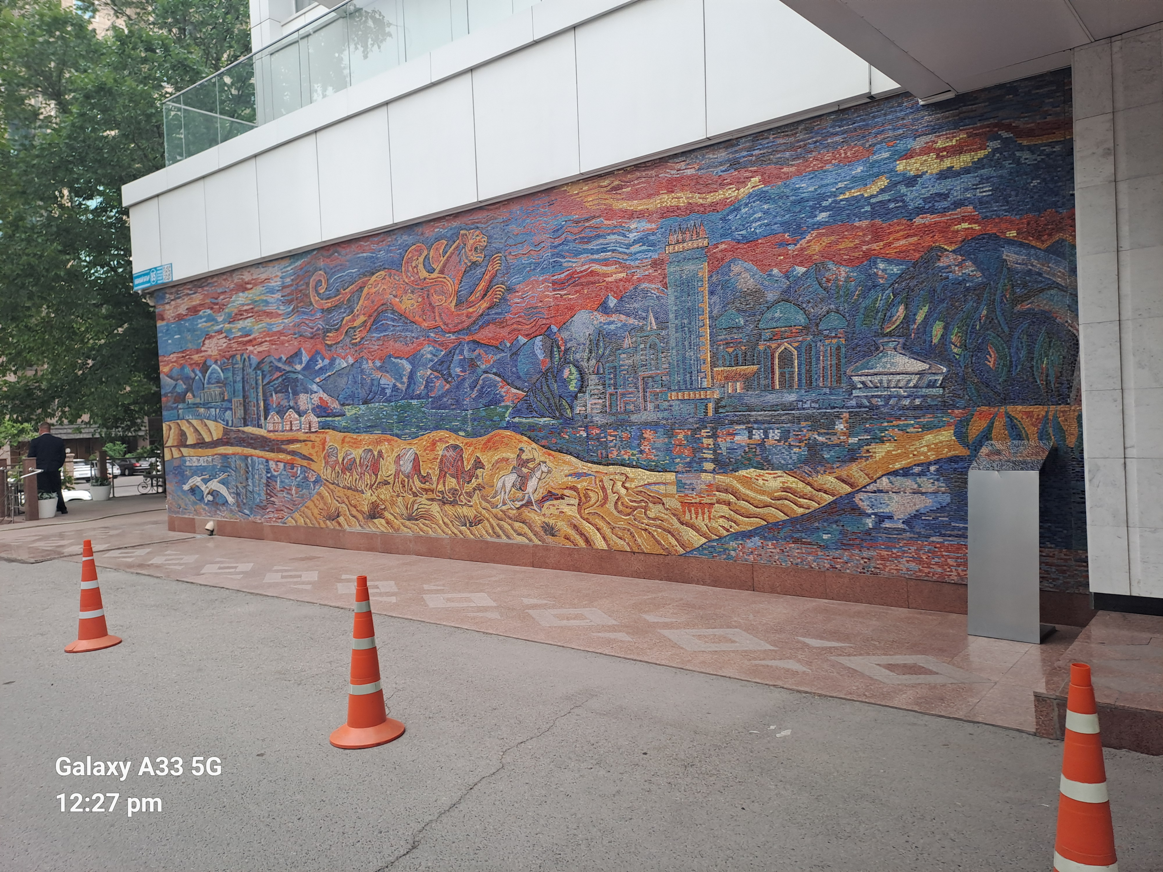 We were shown mosaics which emphasise the history and mythology of the city, giving it its identity and place on the Silk Road. In the second one the snow leopard features in the sky above the caravan.