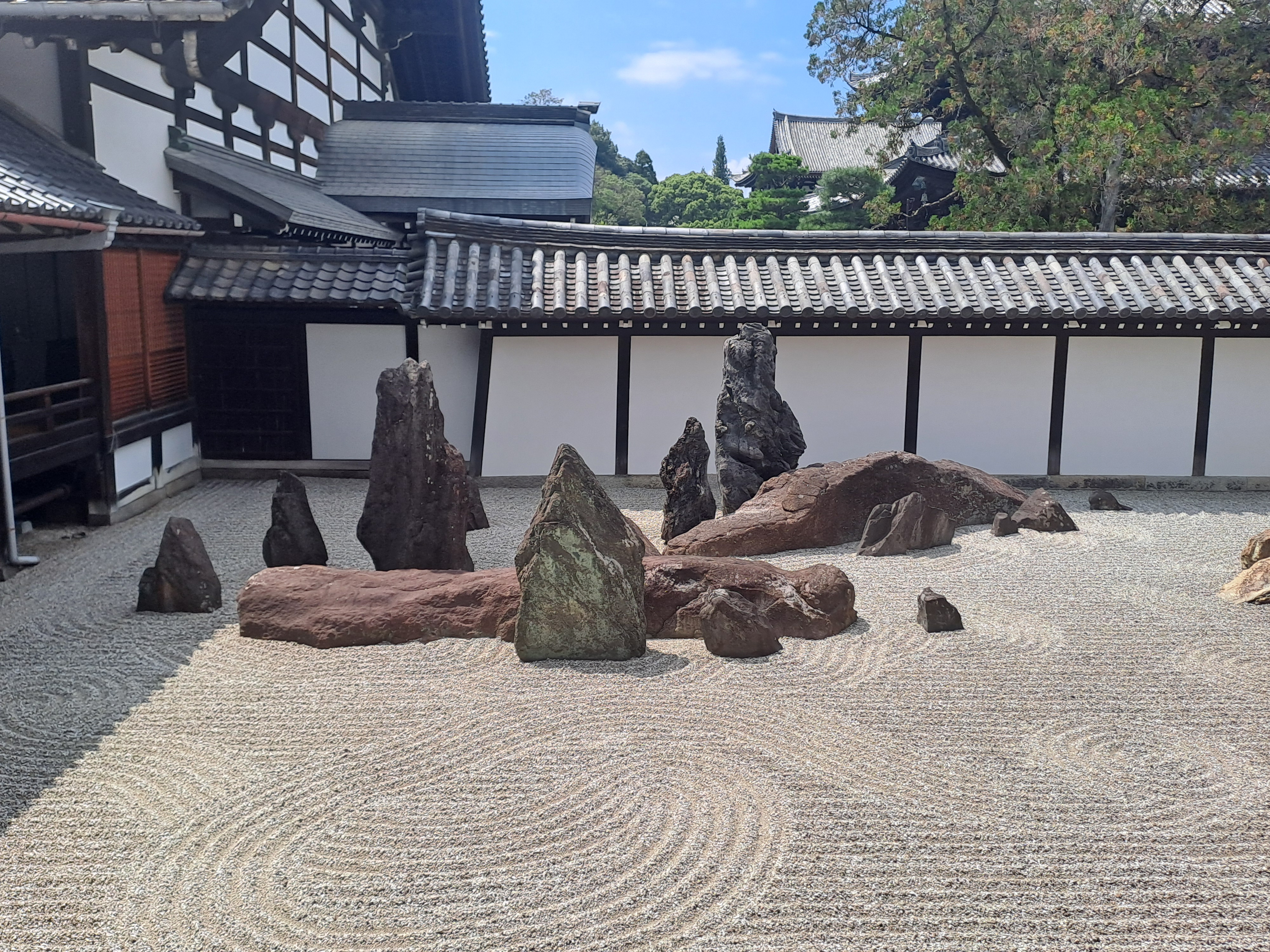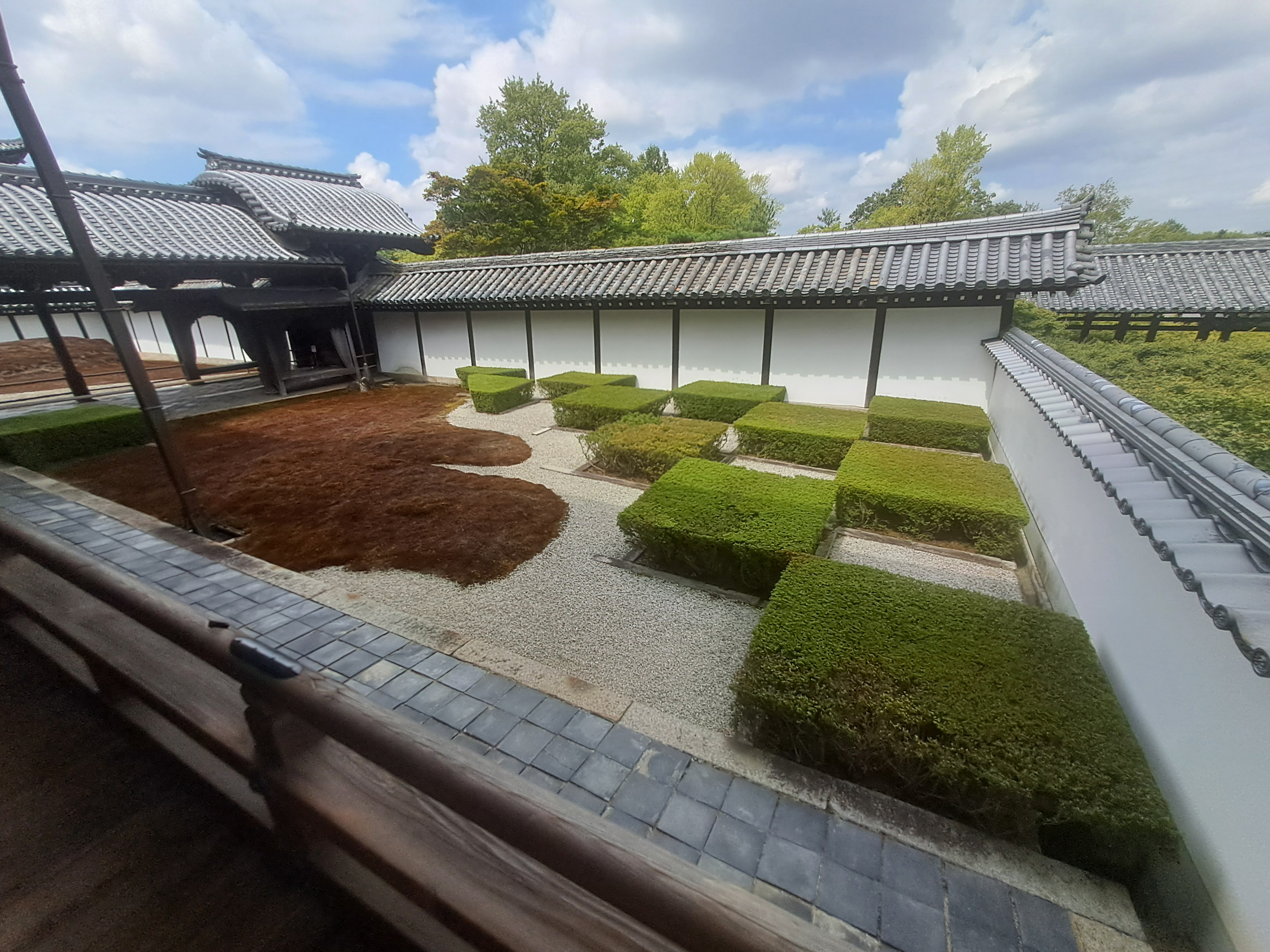 The Eastern garden shows the Great Bear constellation using the temples foundation pillars. The Northern garden uses foundation rocks from the front gate to show a checkered field