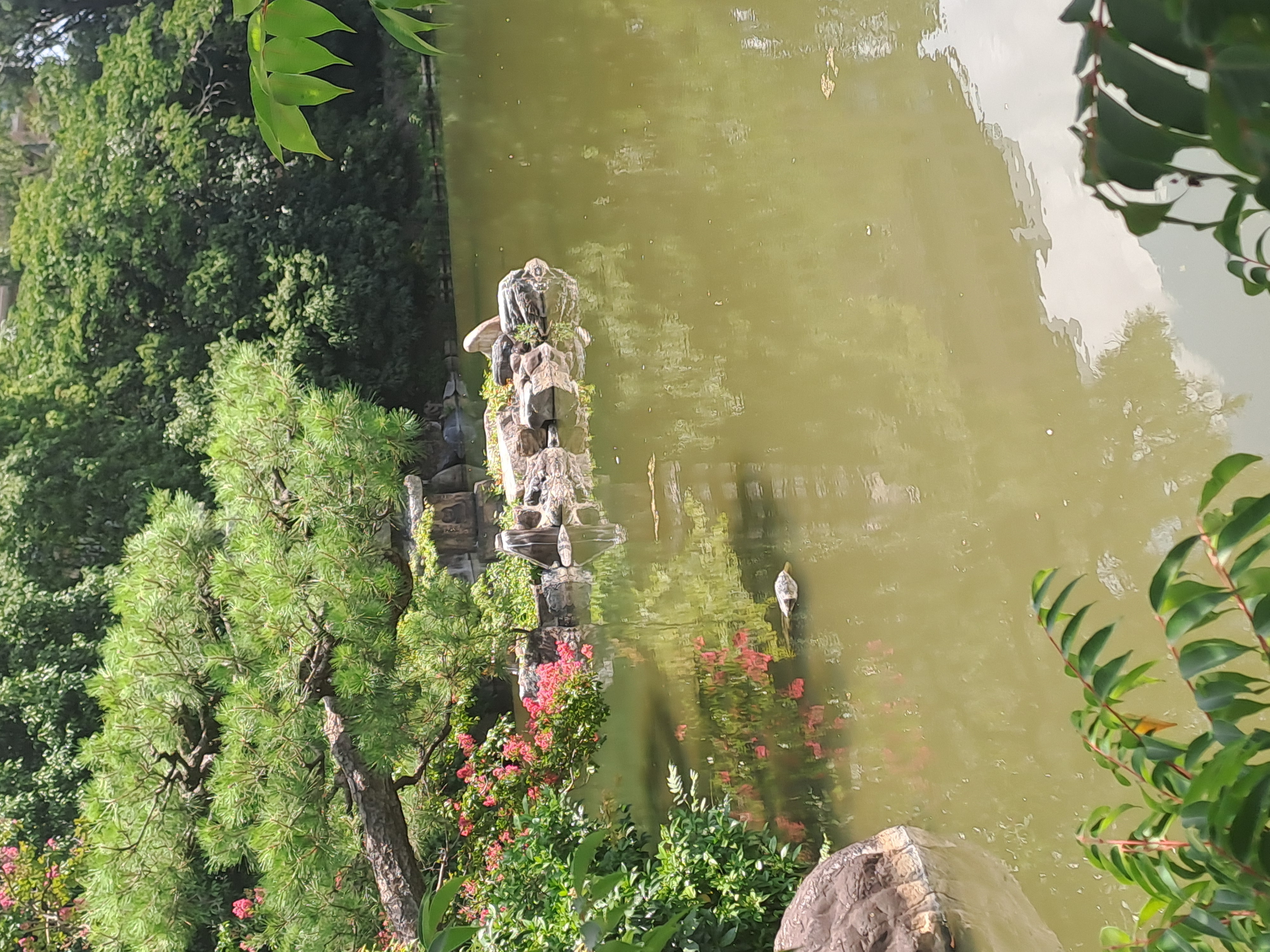 The Western garden uses trimmed azalea bushes to reflect the ancient Chinese way of land distribution.The Southern garden uses rocks to represent the Elysian islands in a rough sea, rocks at the other end represent 5 sacred mountains.