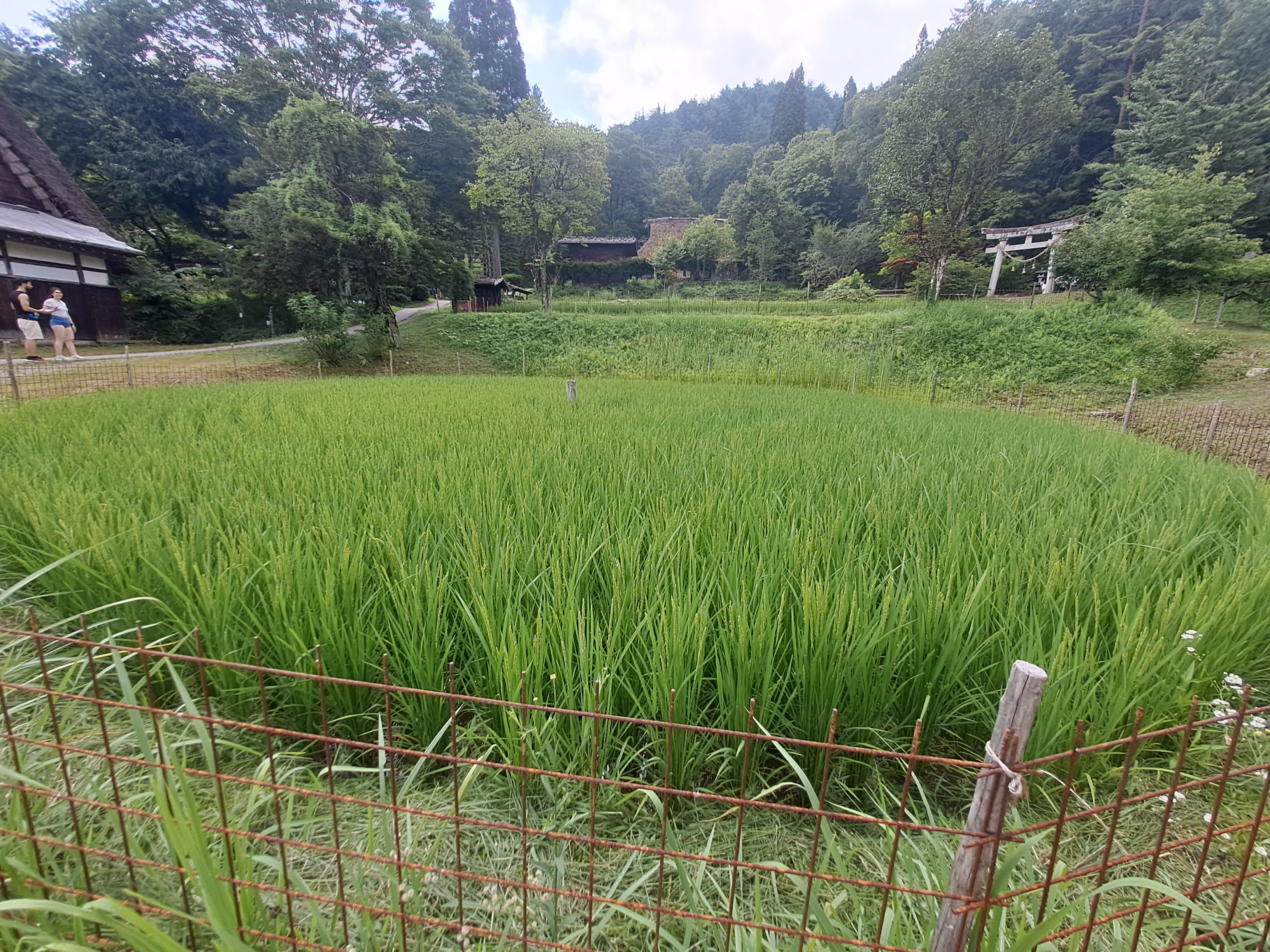The houses all had smoldering fires in to help preserve them. Some had bamboo thatch, which lasts about 80 years. The very rare wheel shaped rice field is historic, it is a sacred site for growing offerings for the jingu shrine. There was also a shiitake mushroom growing area.