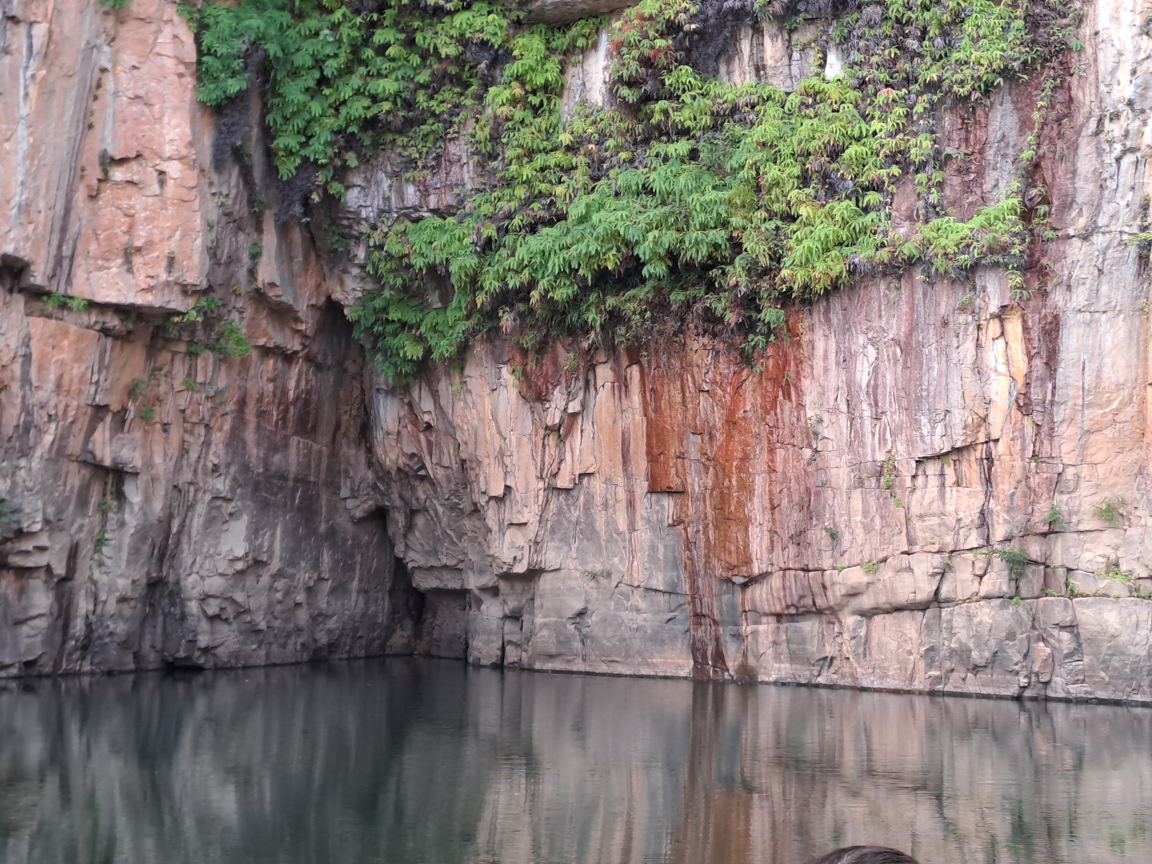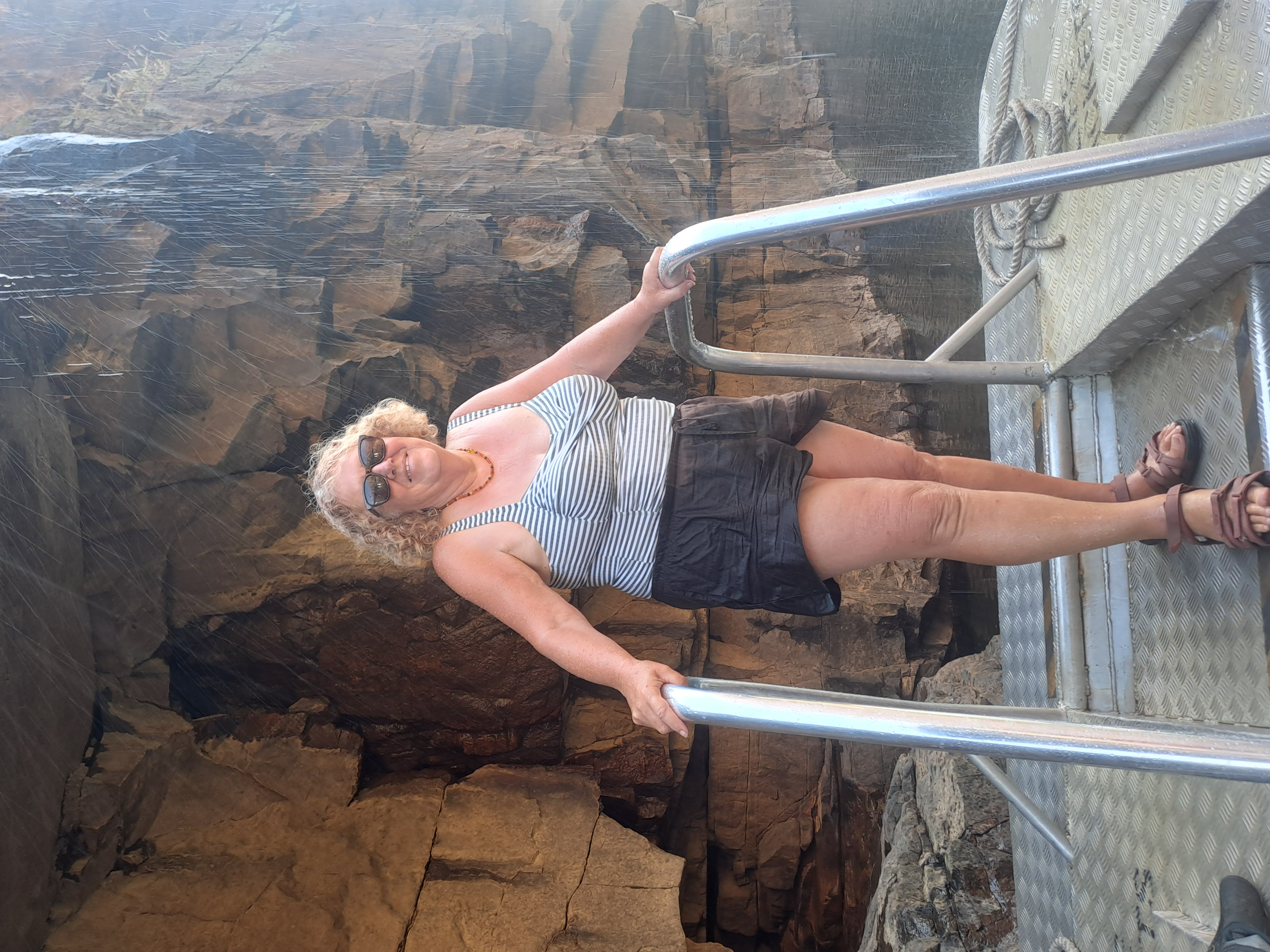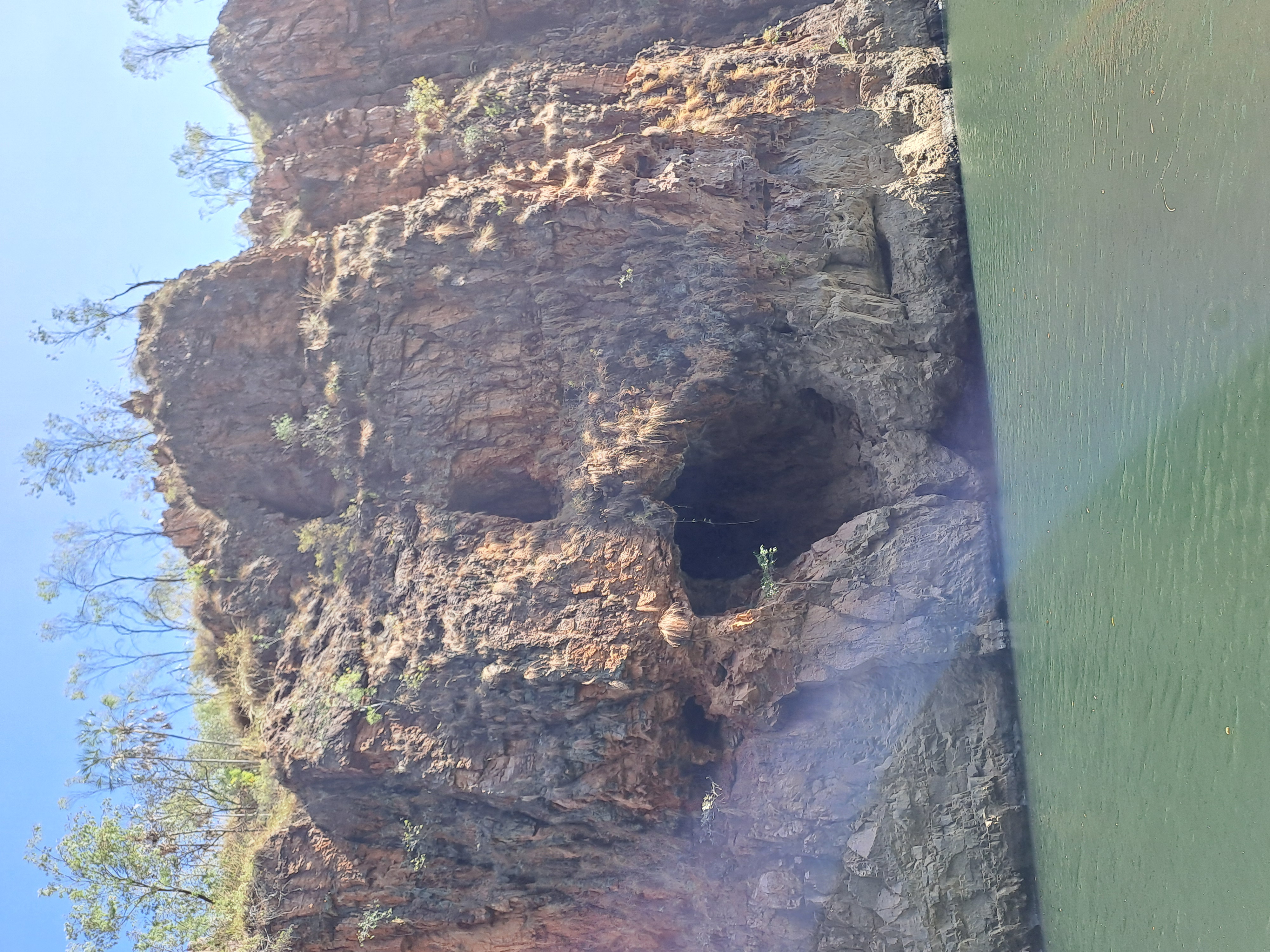 The next day I explored a bit further up the gorges. The photo of the caves is because most wet seasons the level rises up halfway on the big cave. But it has been known to be above the top cave. The photo of me is just after being under a waterfall for us to all cool off. We then went swimming in a rock pool between the gorges. In the wet season there is one navigable course through the bottom gorges. Thus when boats can be repaired or replaced. In the dry they are in three separate gorges with natural rock barriers between.