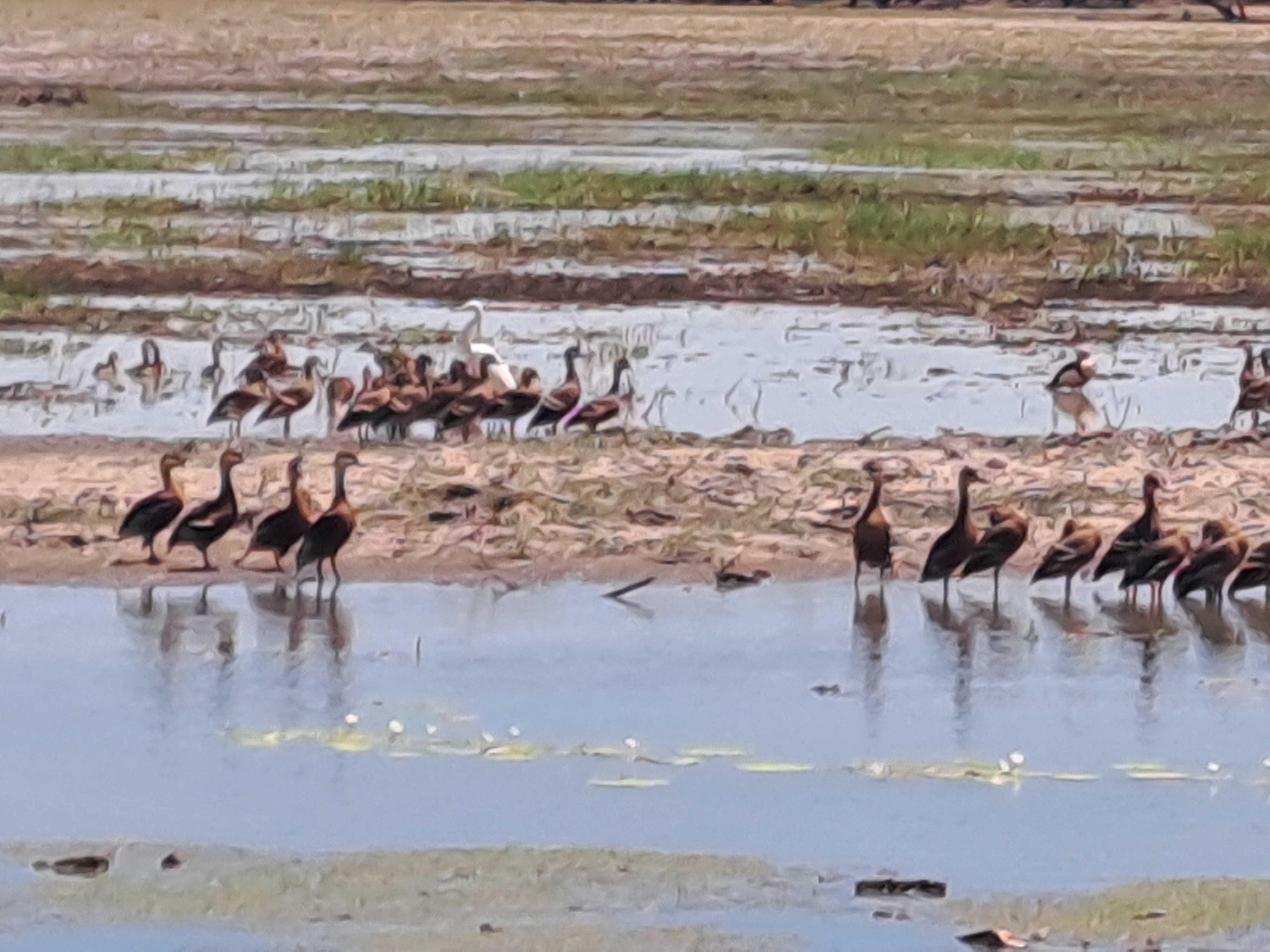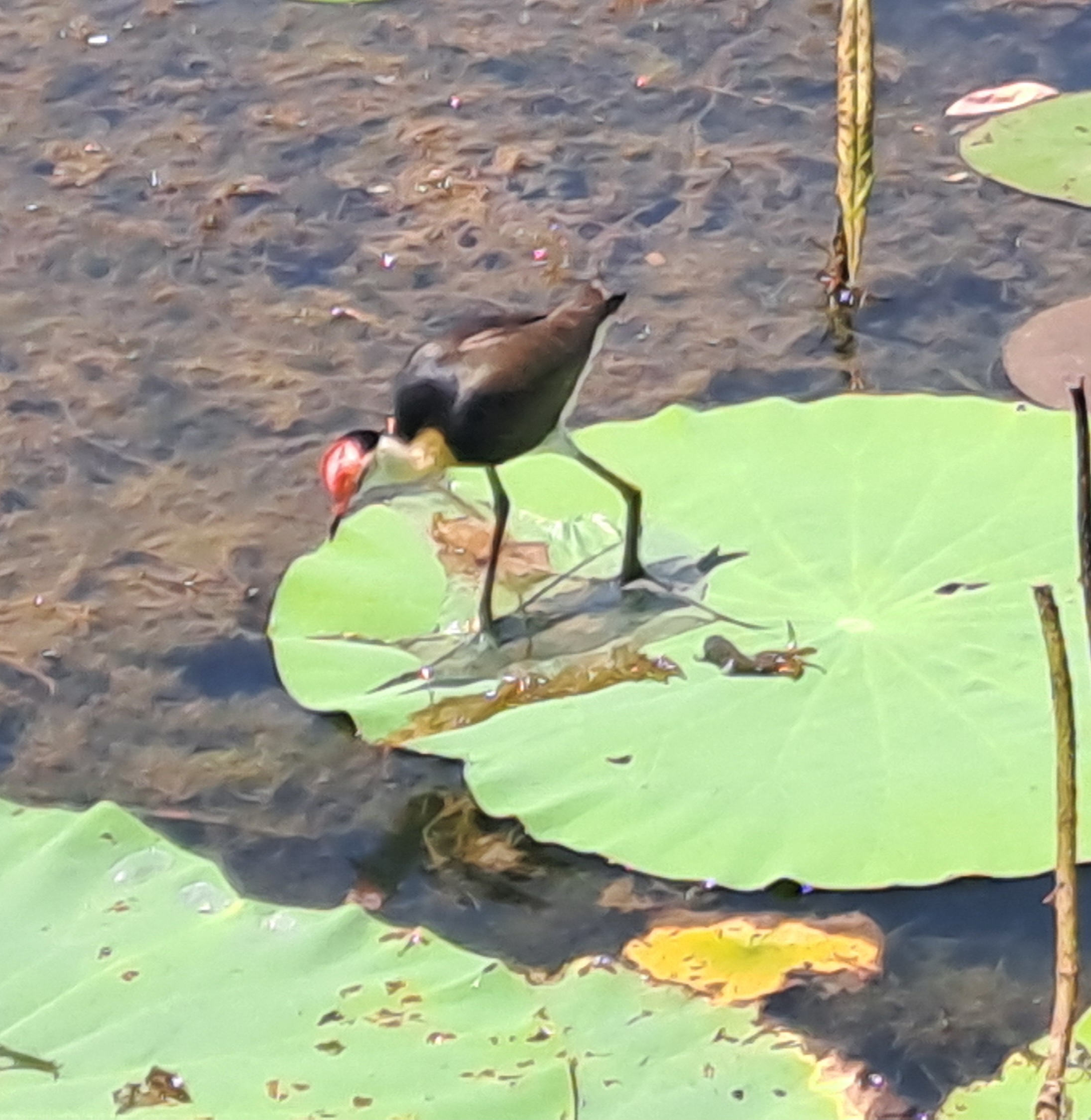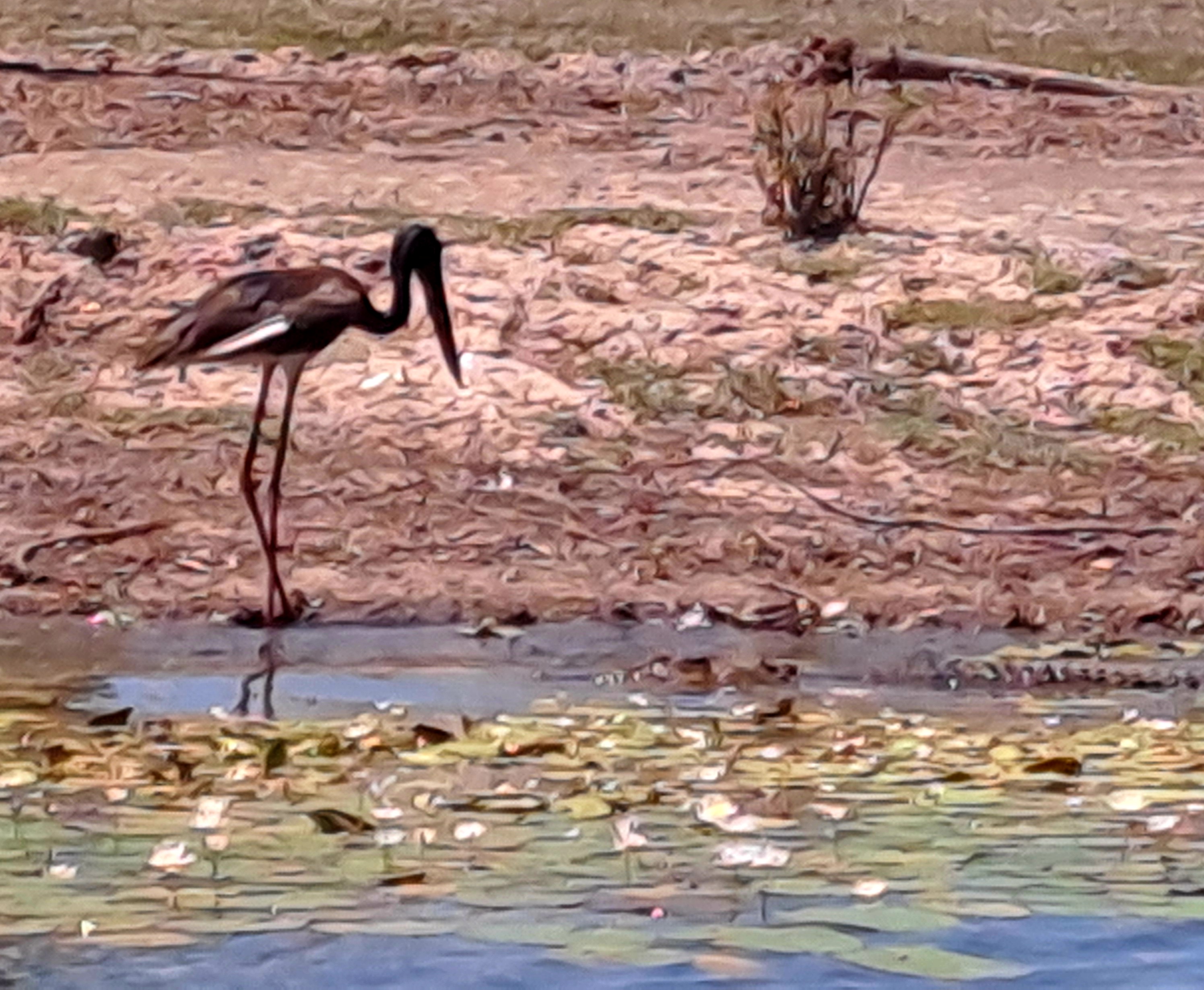 We saw a whole family of baby Jacana birds out on the lily pads that had just hatched. Also a variety of different Egrets. Pelicans and several Jabiru amongst others. The Jabiru below is carefully eyeing up the crocodile next to it.