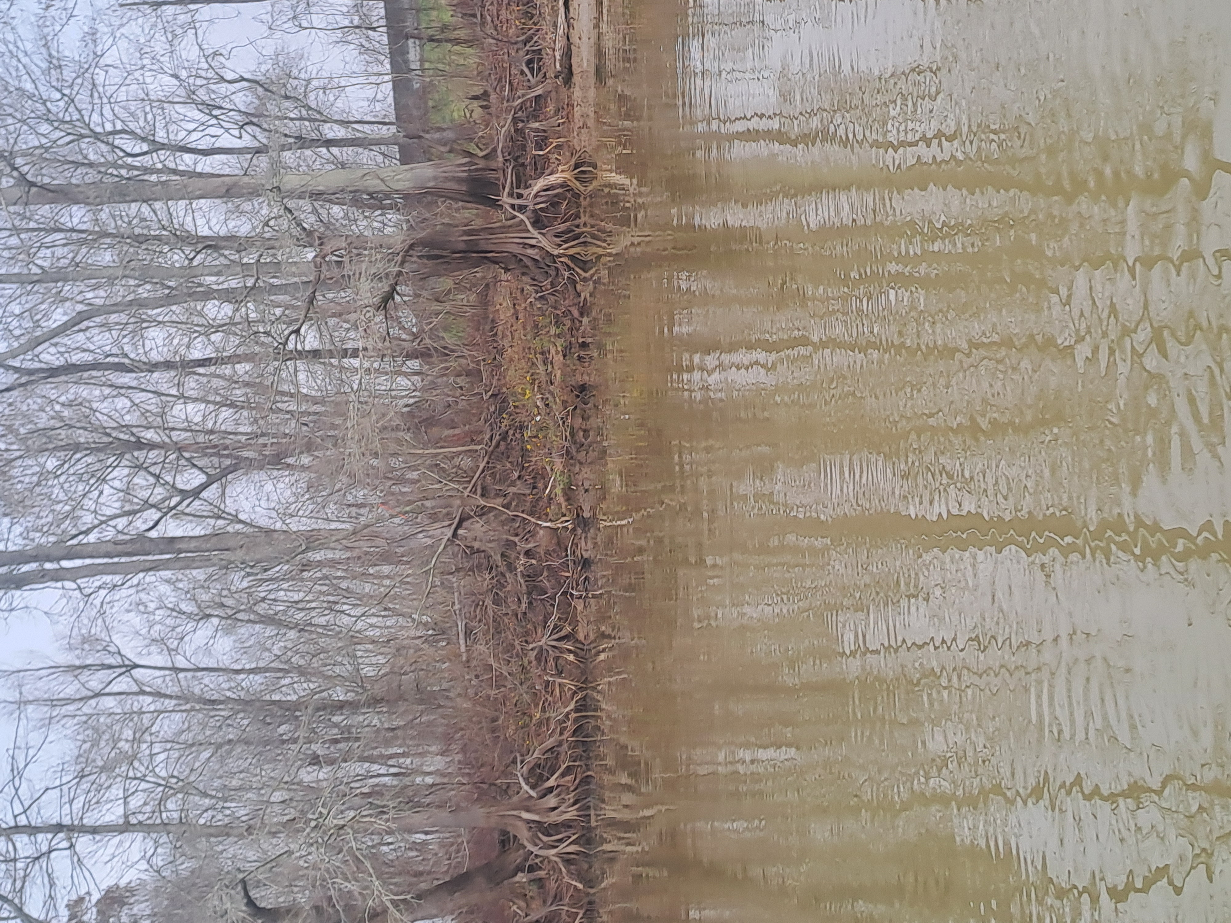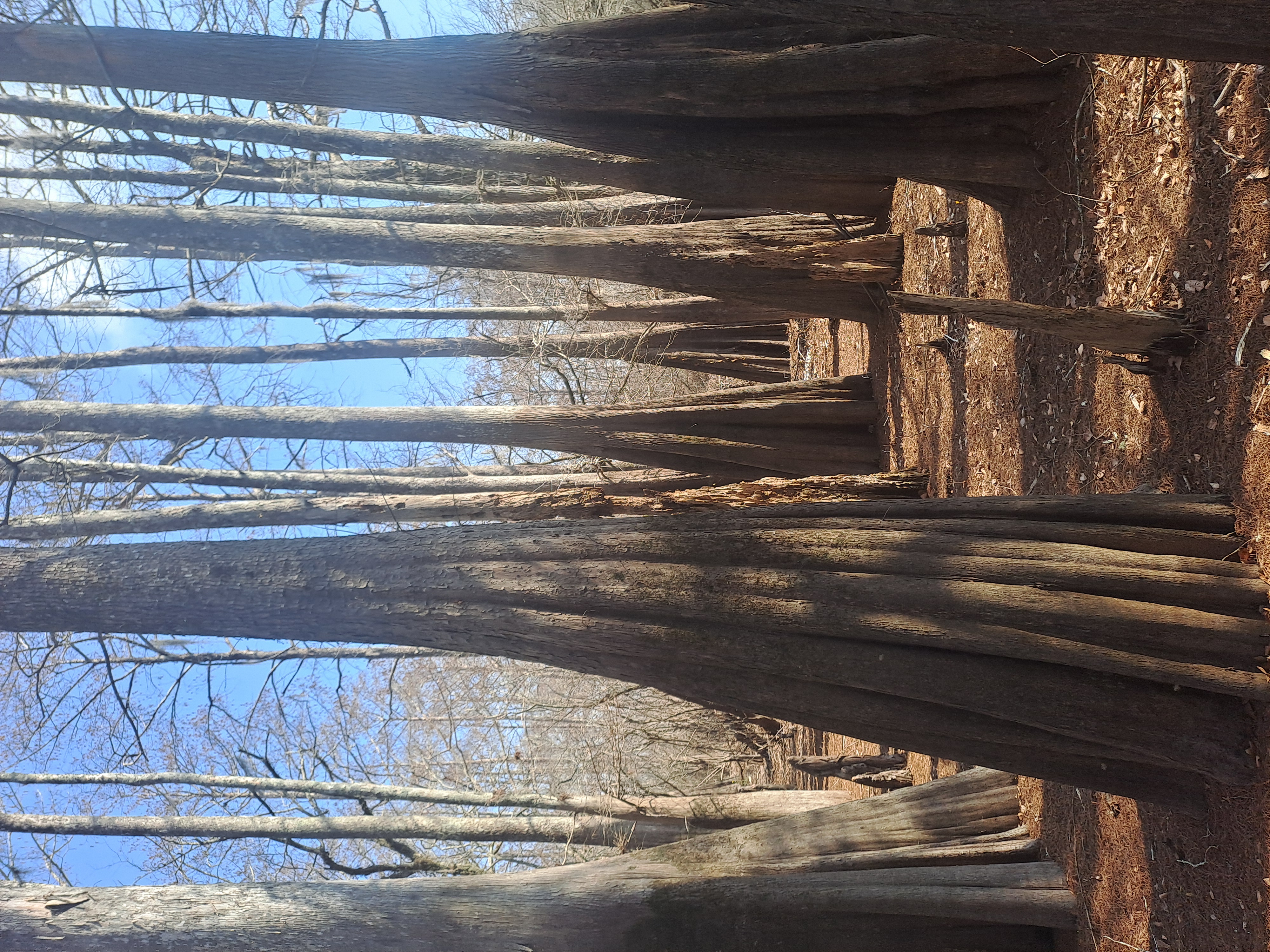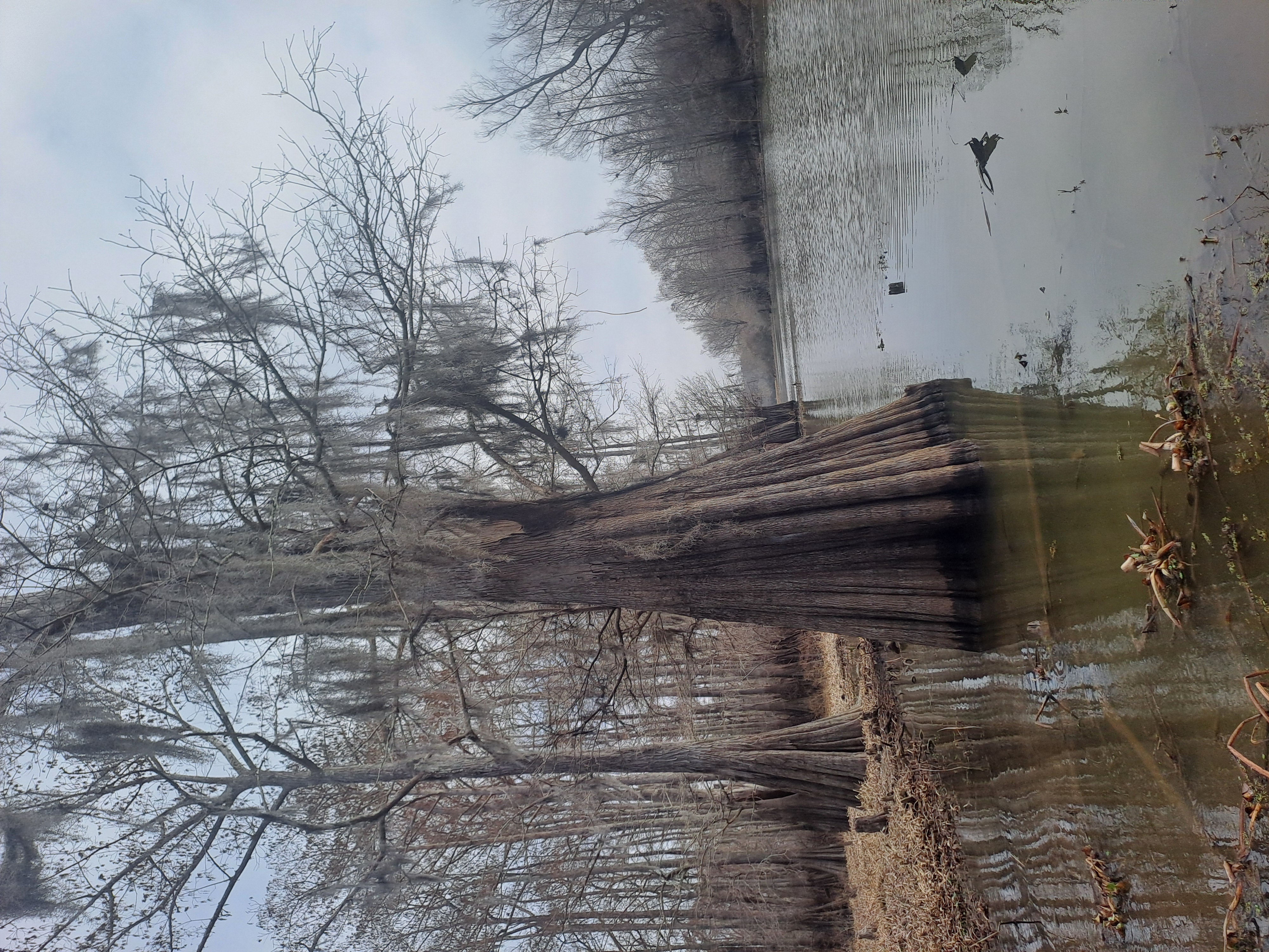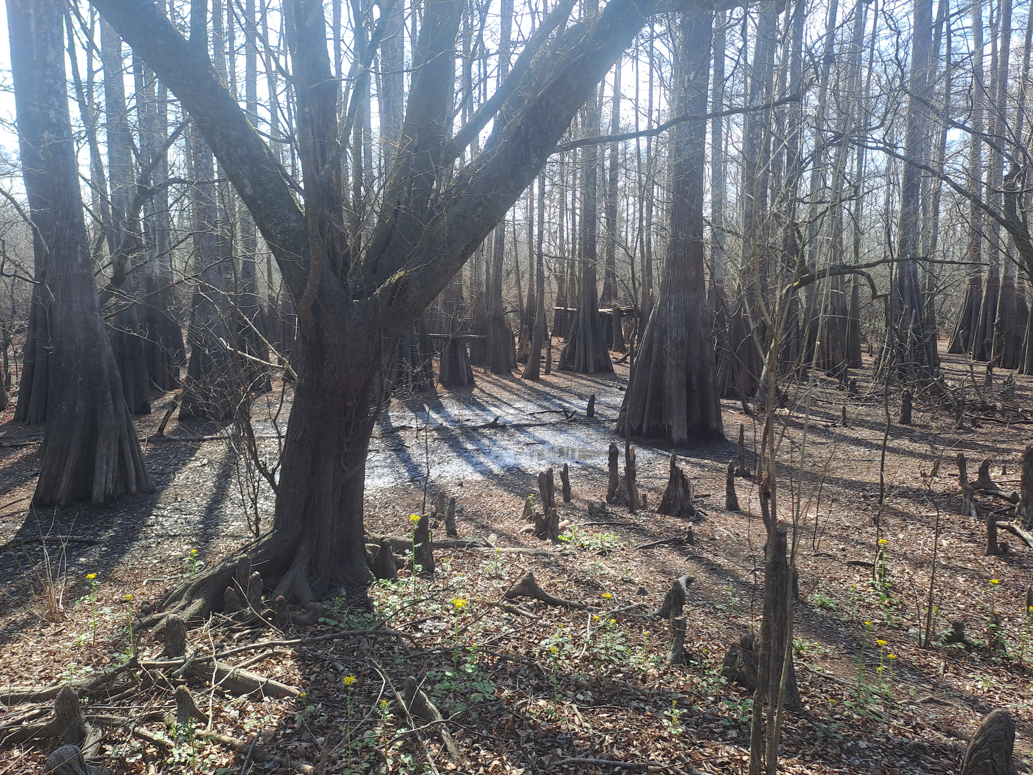 The dominant tree here is the bald cypress with its butresssed trunk and knees as the sticking up roots are called. Some just surface as knees, some are much more above ground.