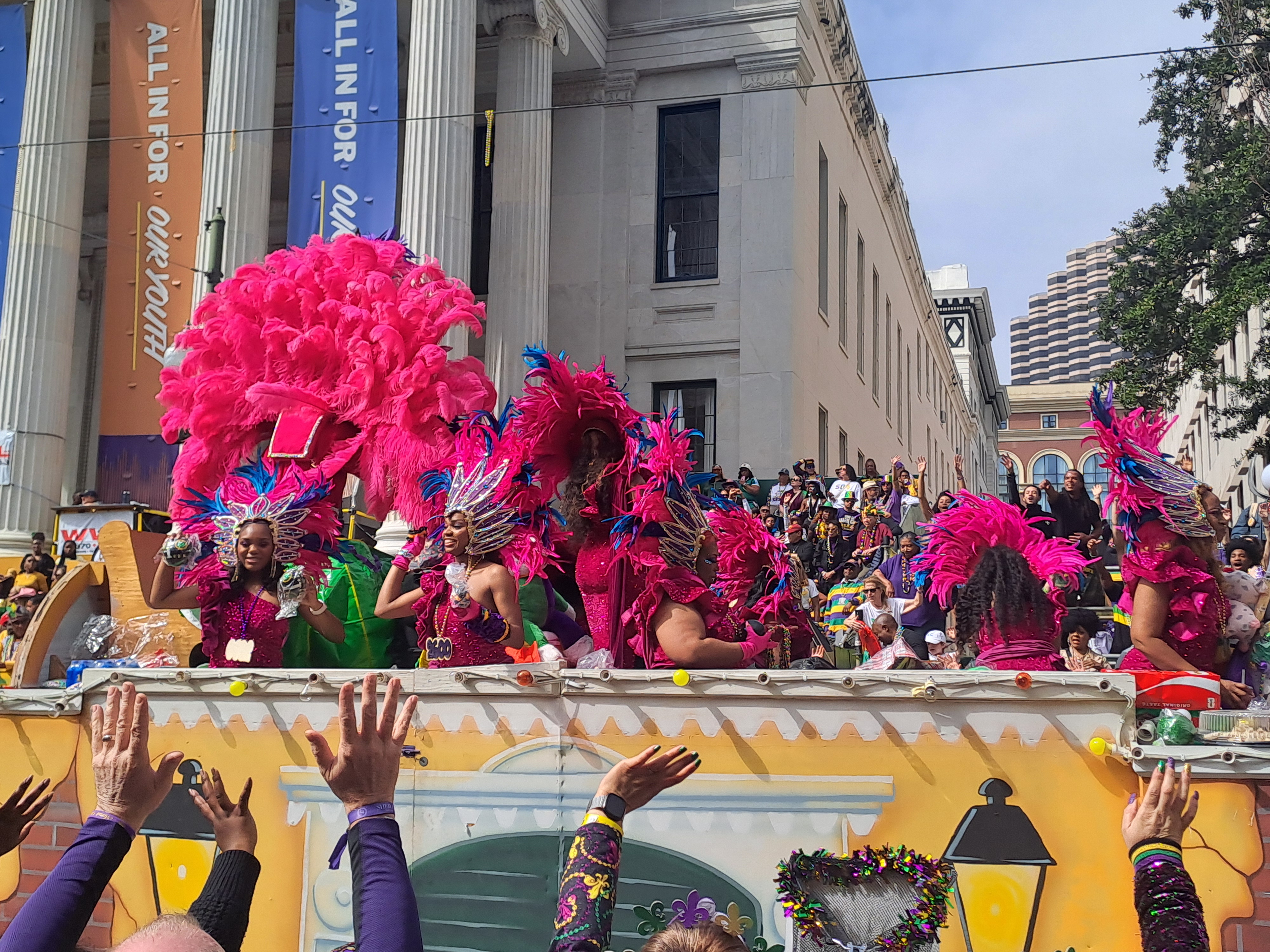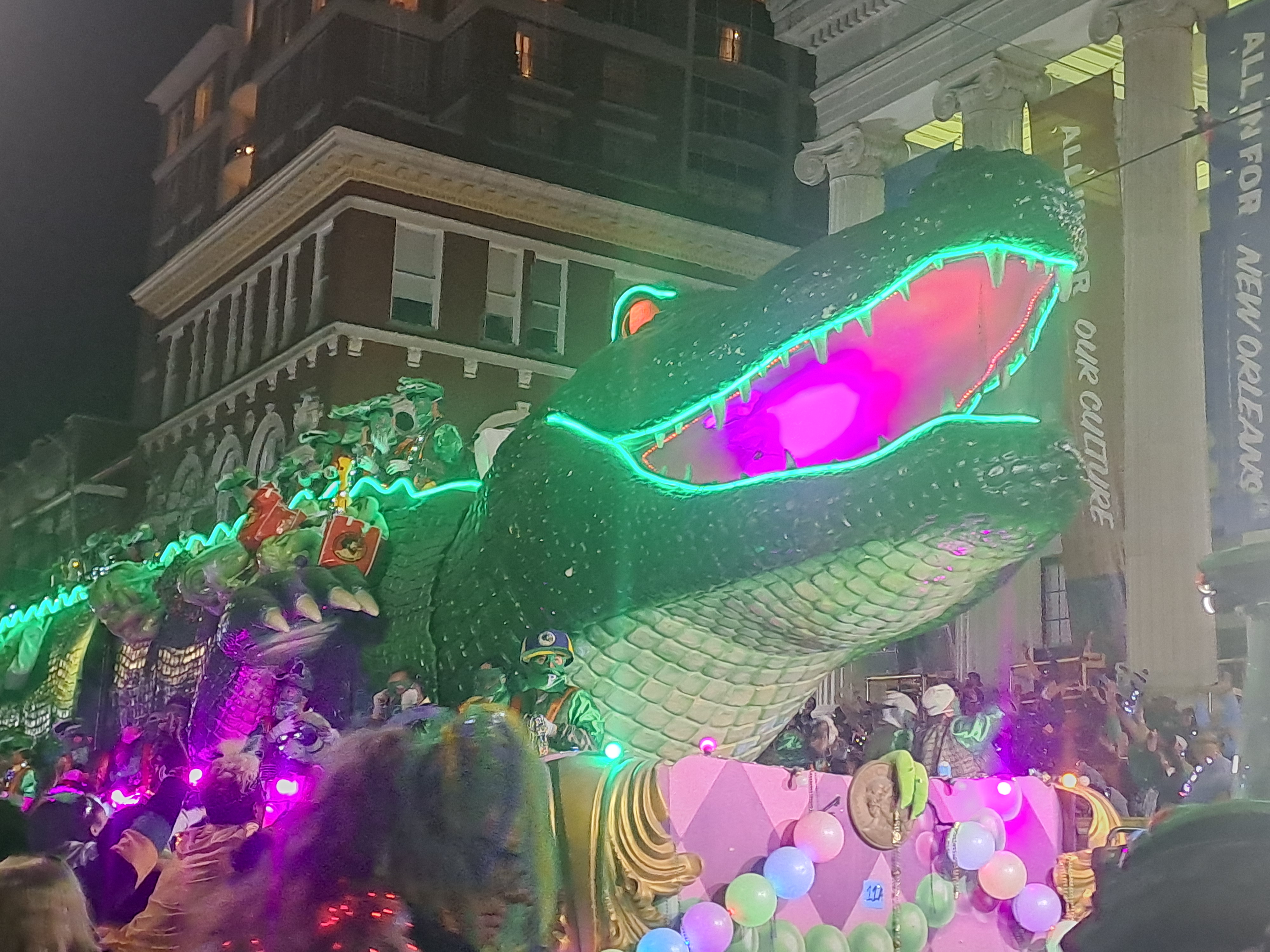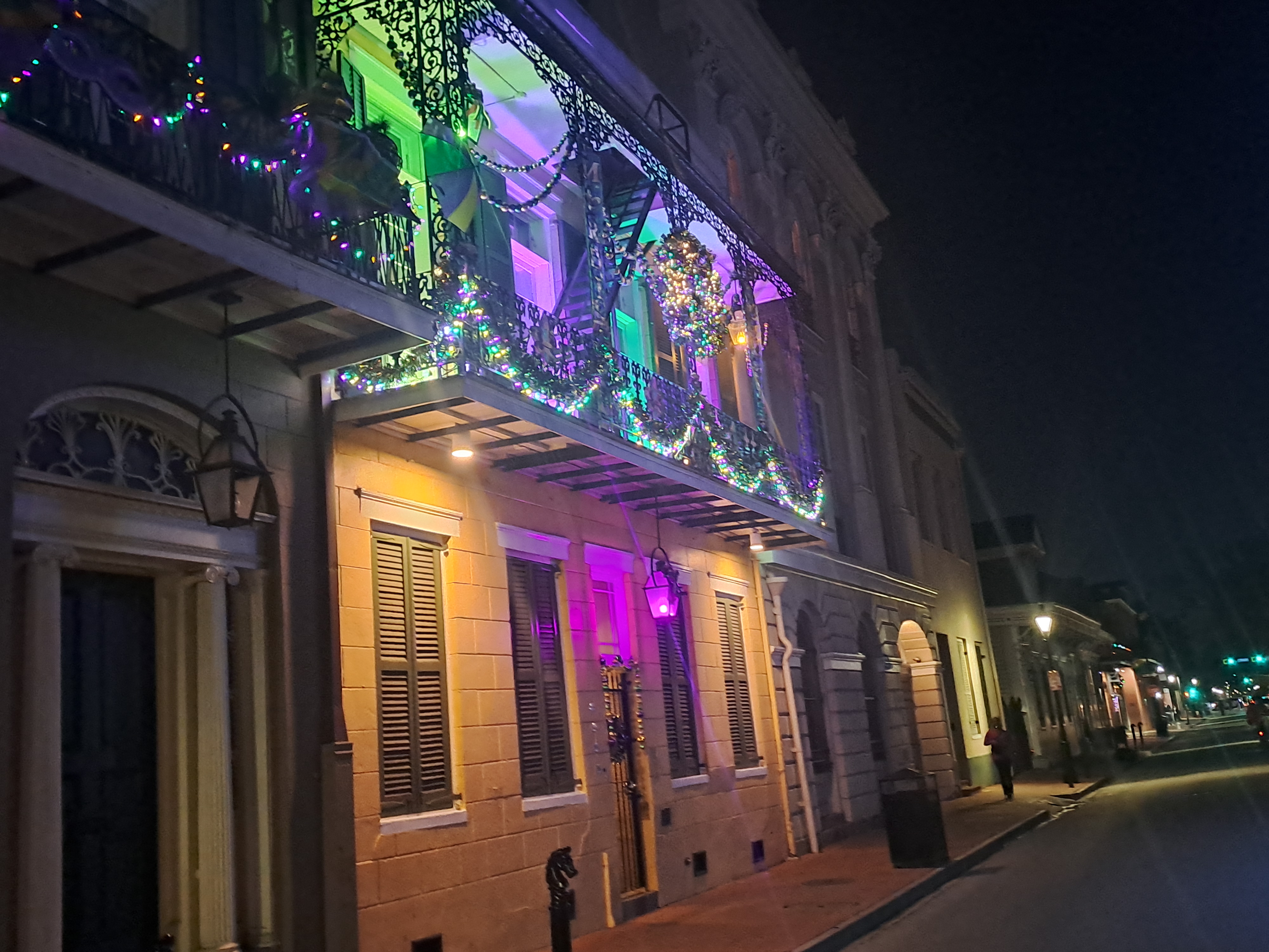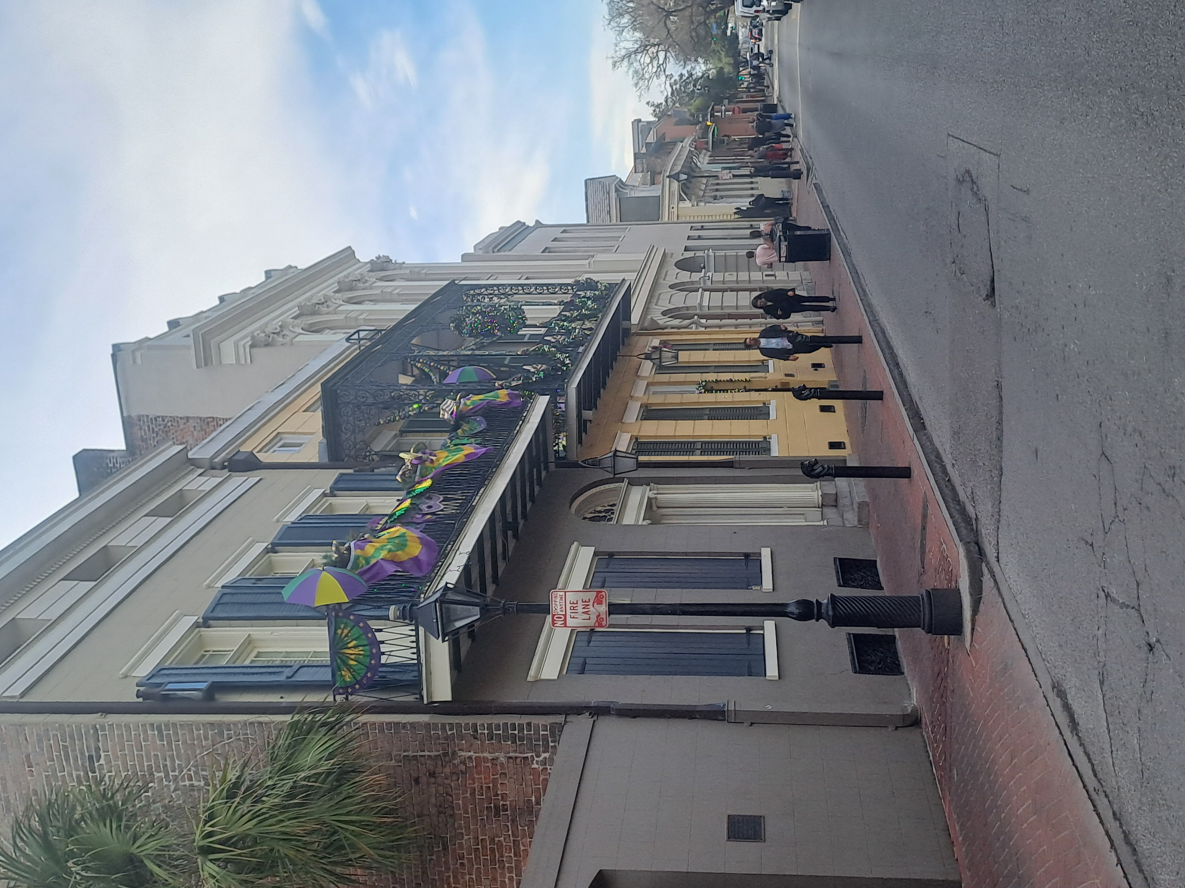 The buildings often have balconies all of which can become viewing platforms or places to be seen. At night people may flock below balconies to collect beads thrown from above. Beads are everywhere!