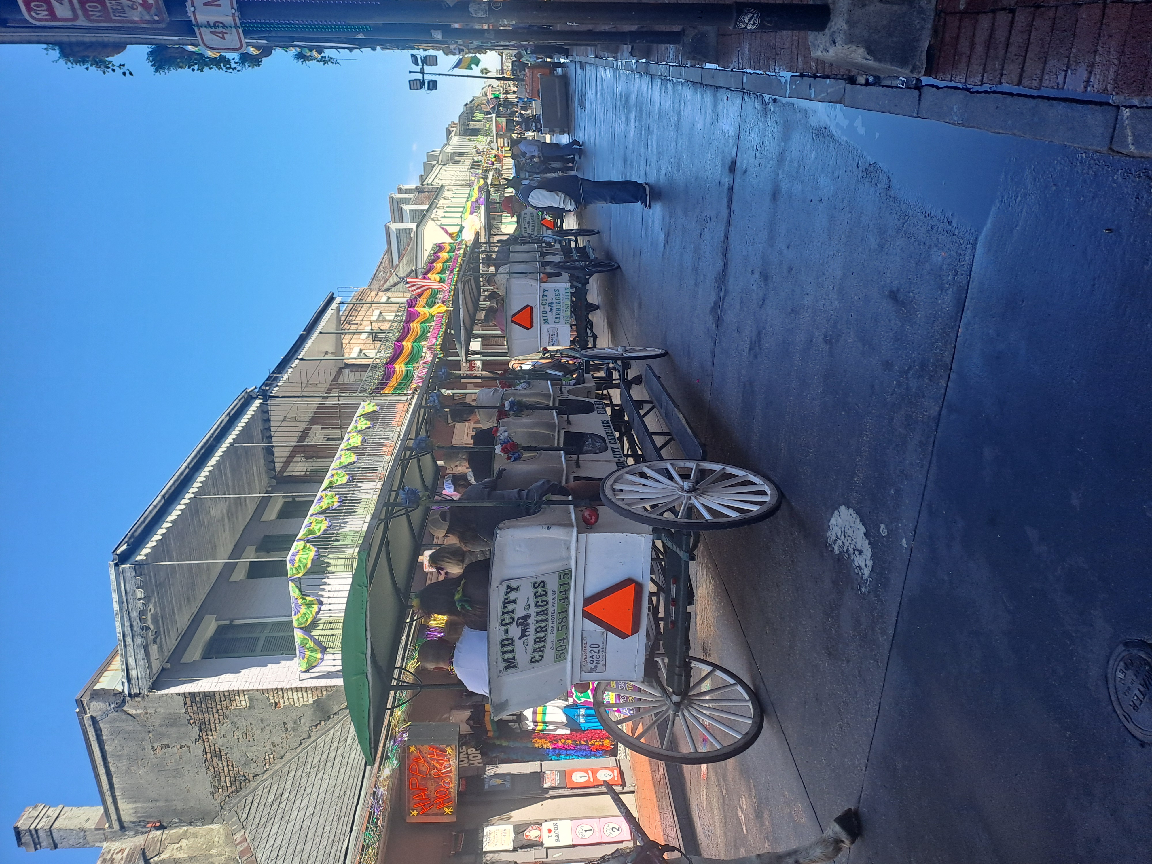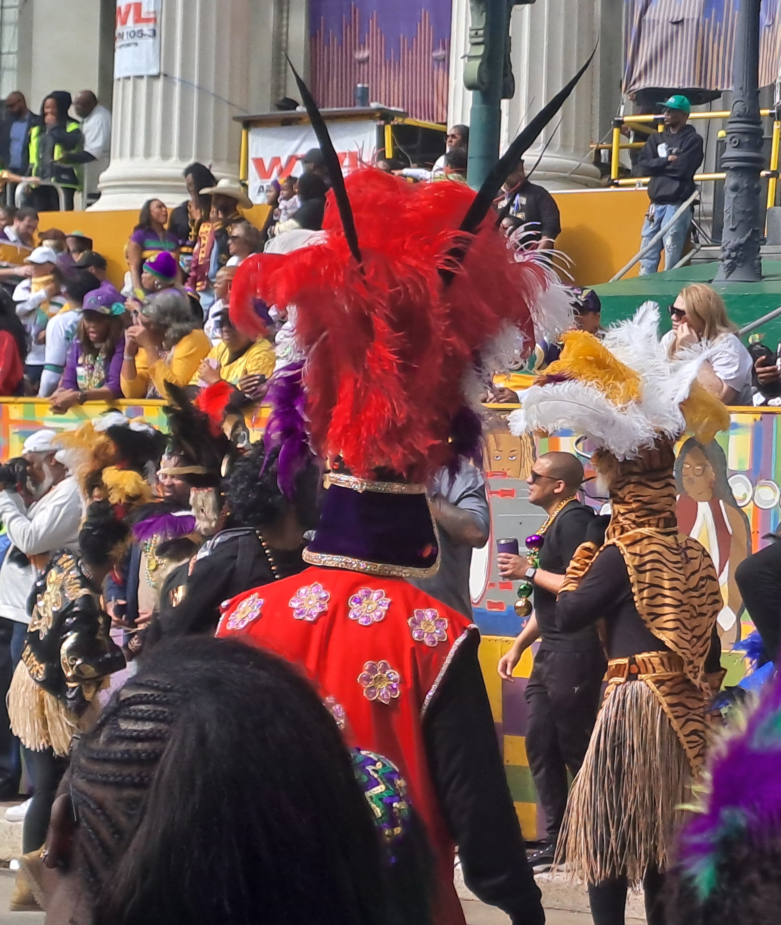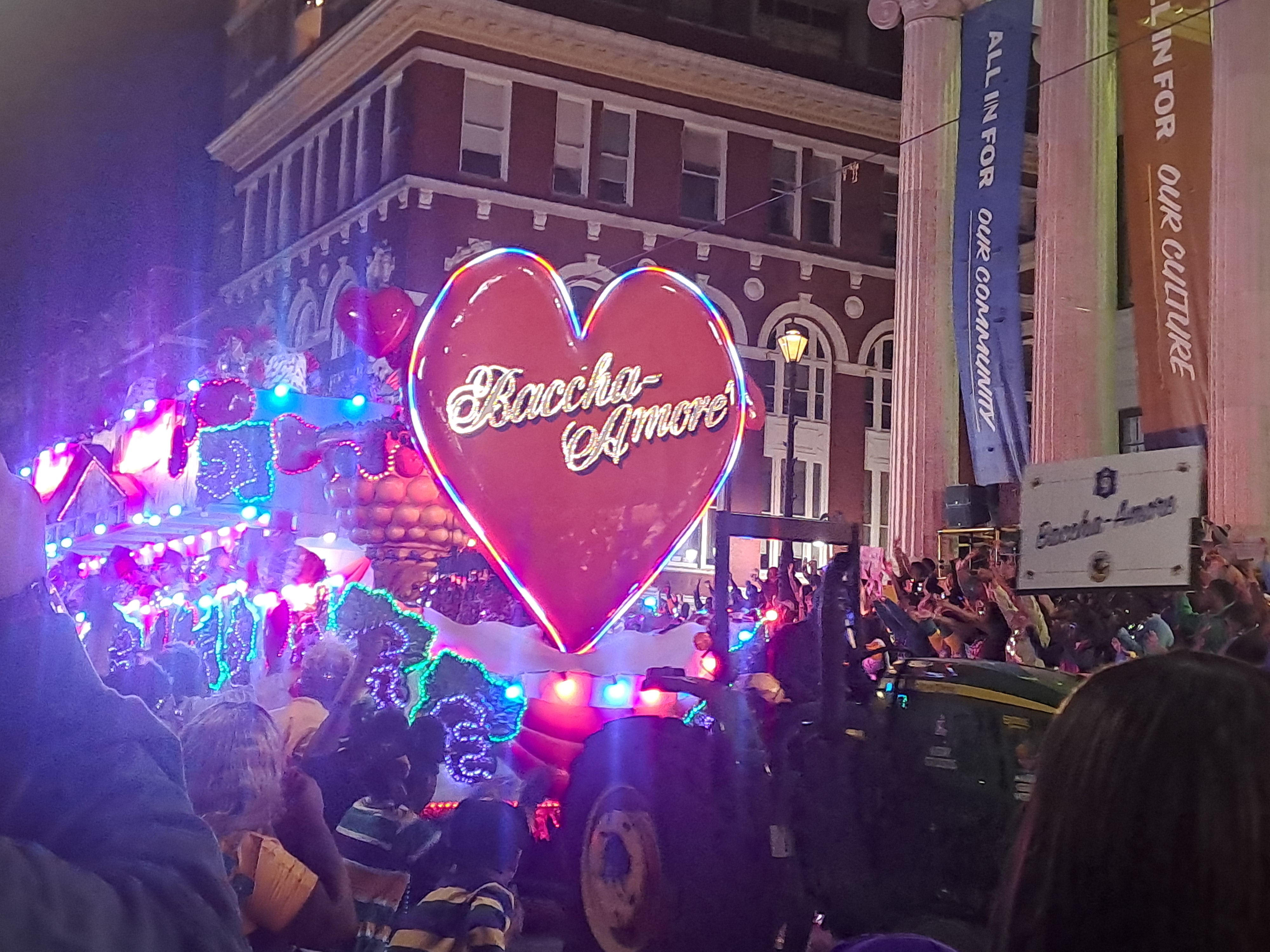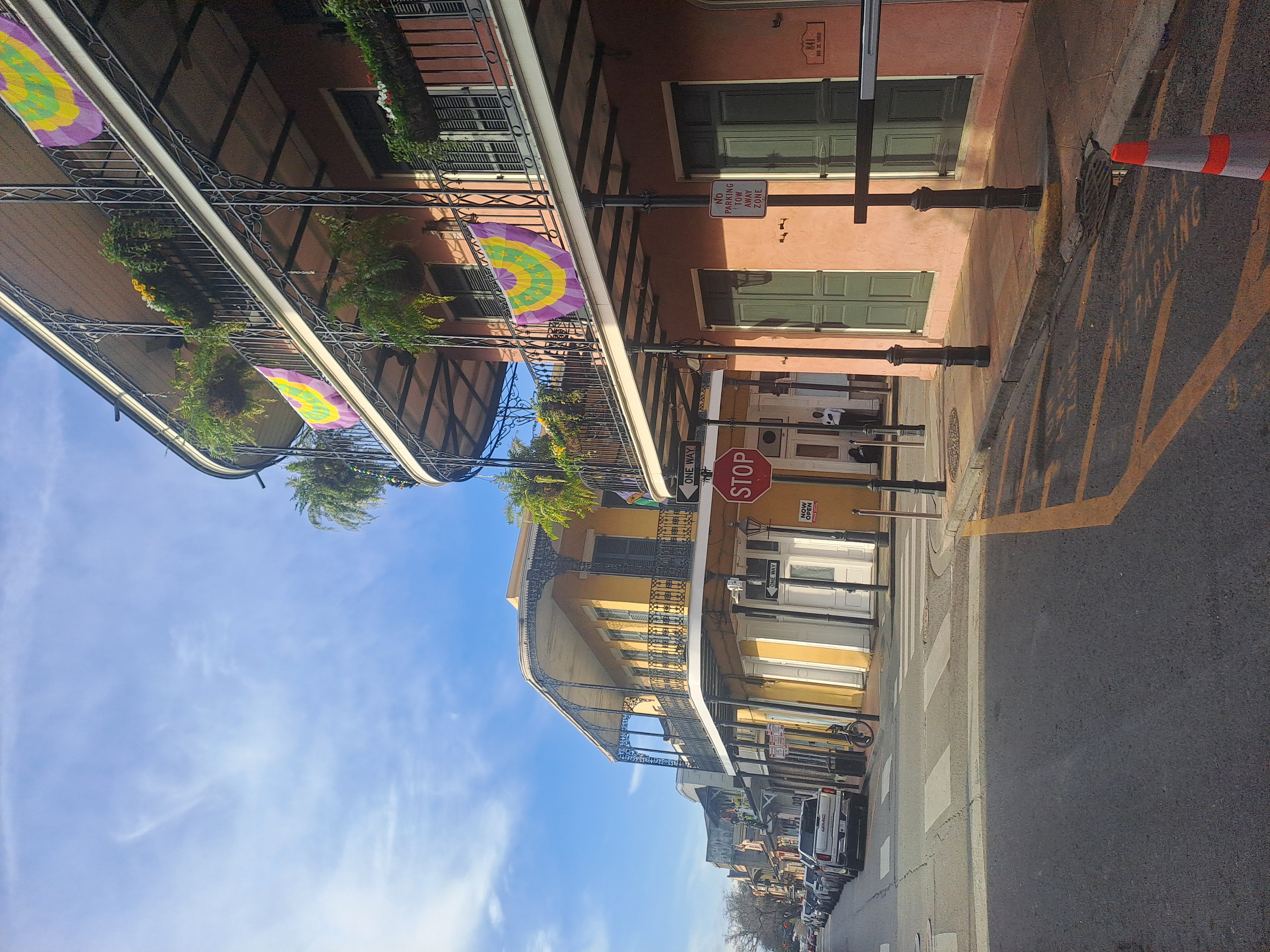 The buildings often have balconies all of which can become viewing platforms or places to be seen. At night people may flock below balconies to collect beads thrown from above. Beads are everywhere!