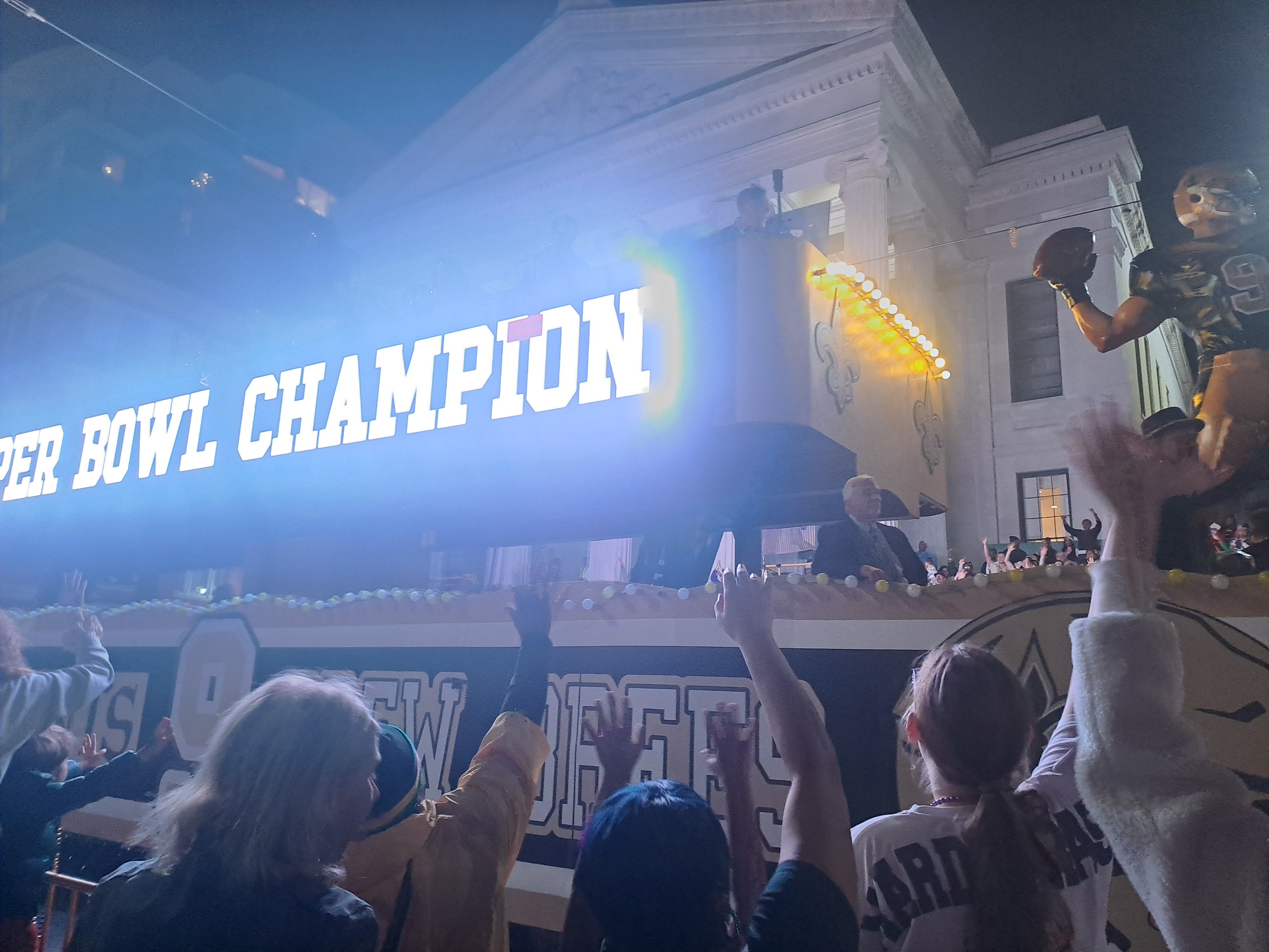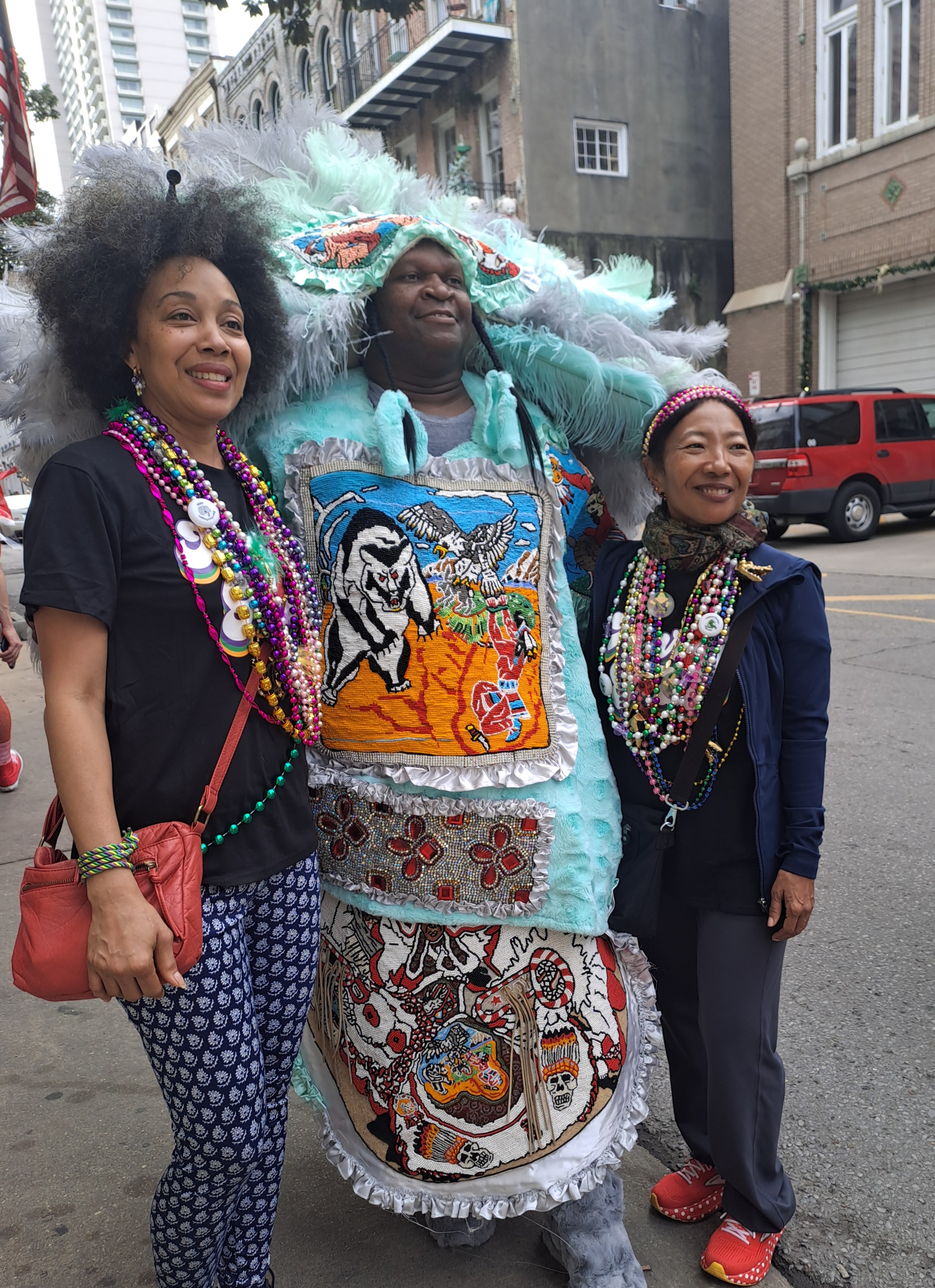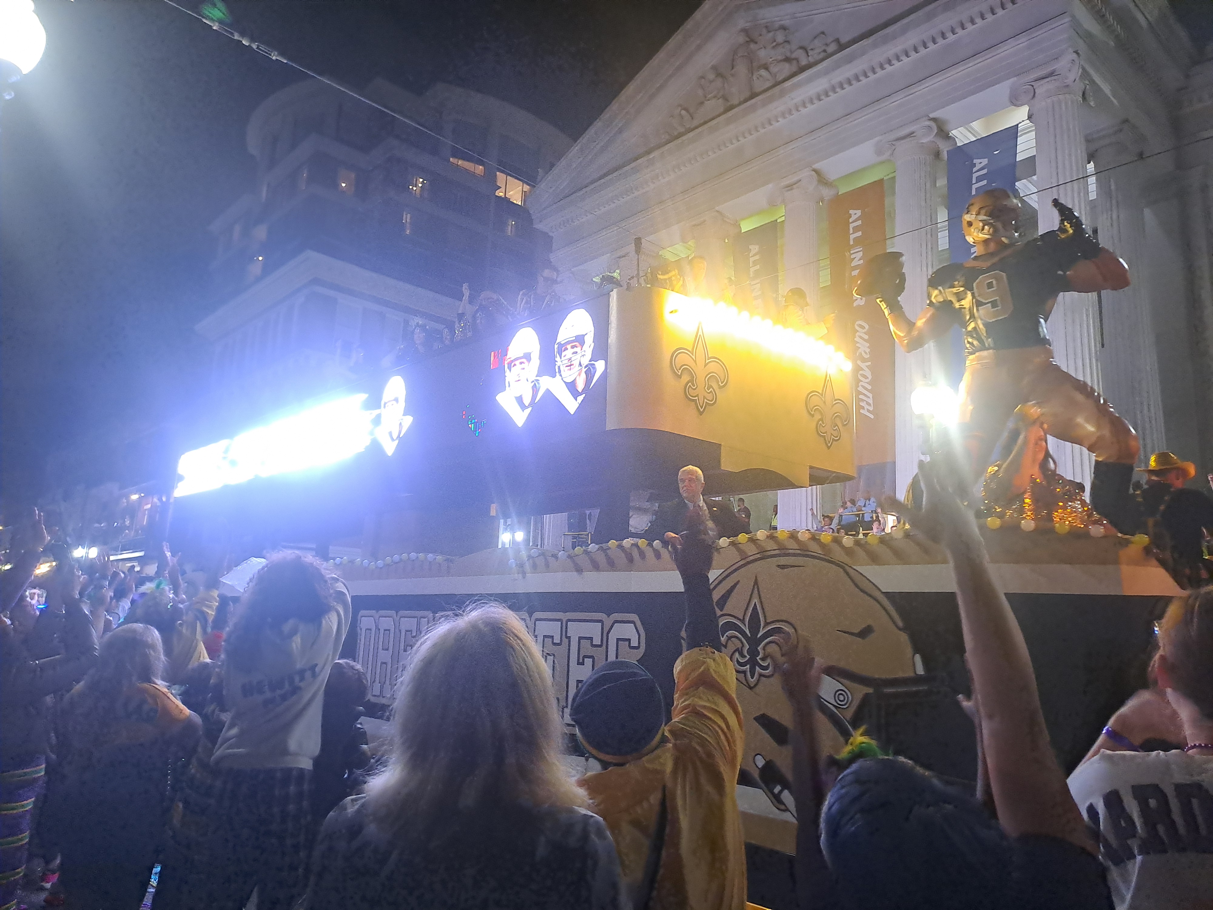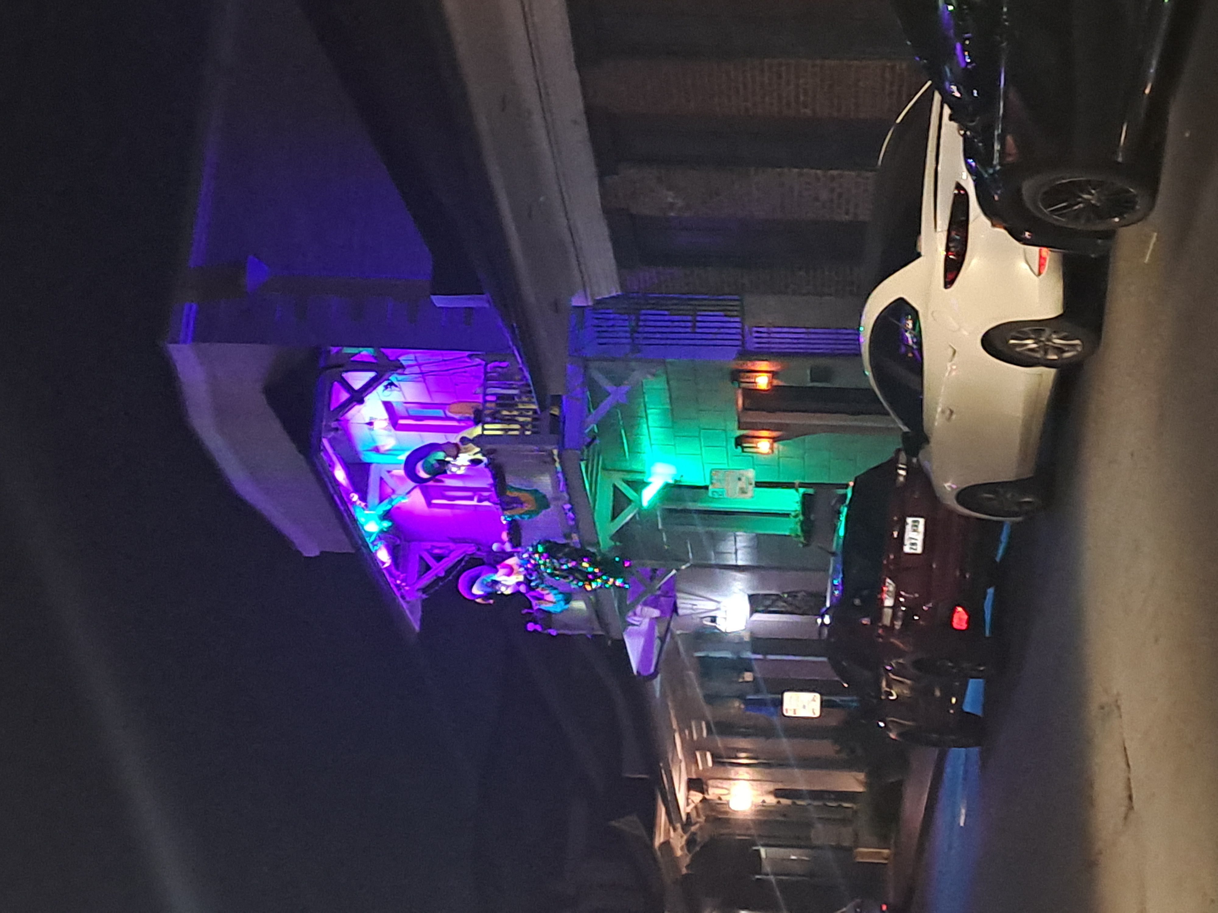 The buildings often have balconies all of which can become viewing platforms or places to be seen. At night people may flock below balconies to collect beads thrown from above. Beads are everywhere!