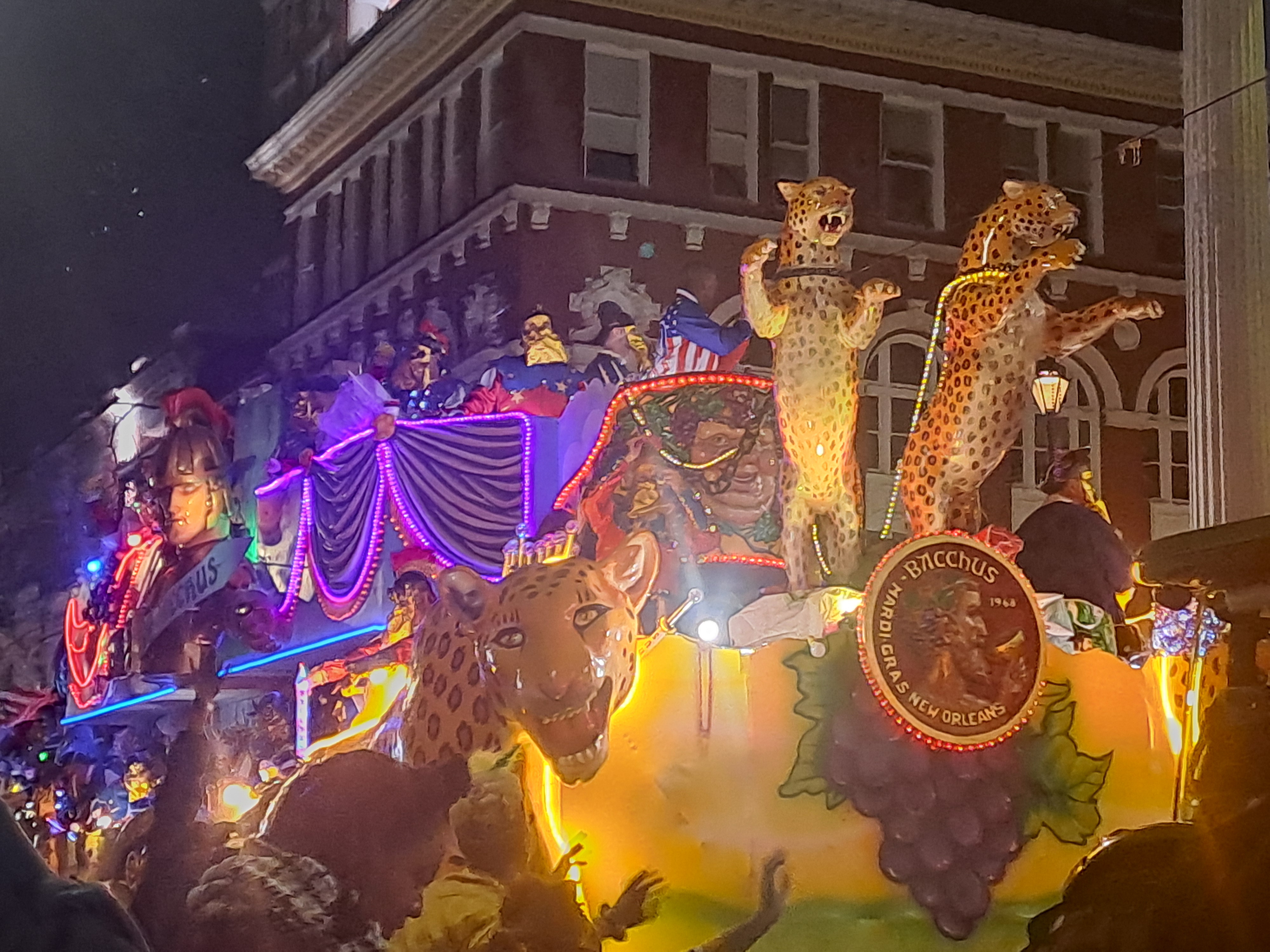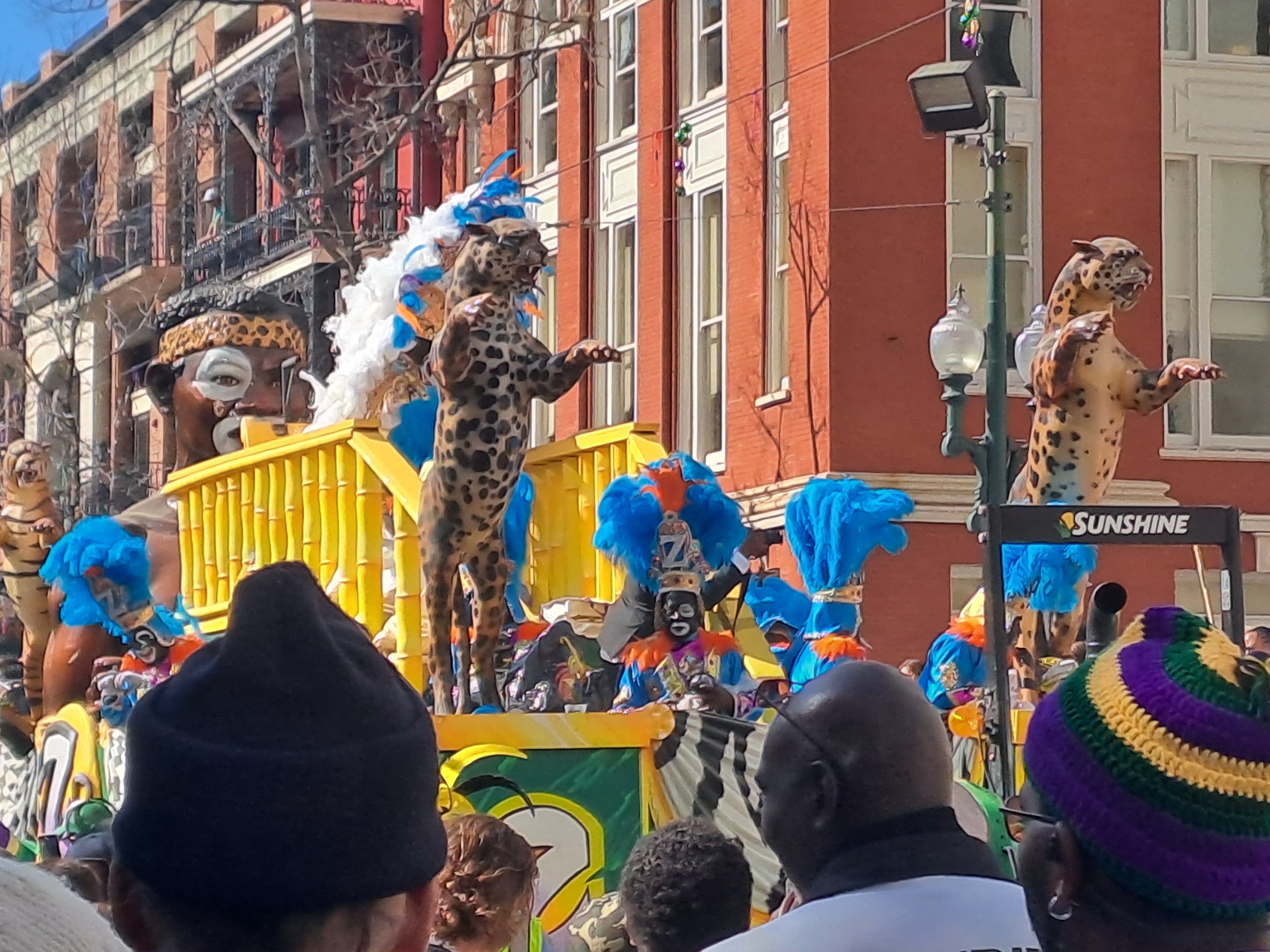 Our first parade was Bachaas. Great floats dedicated to the god of wine, also for the superpower champions, which I finally worked out was football, and a giant crocodile. Each float was two storeys filled with people throwing beads and trinkets.