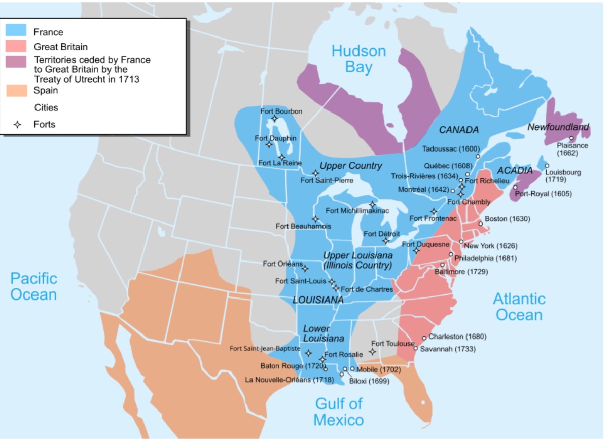 France originally colonised nearly all of North America and Canada at its peak in 1710 it was New France, and then Louisiana. This territory was lost after the seven years war.