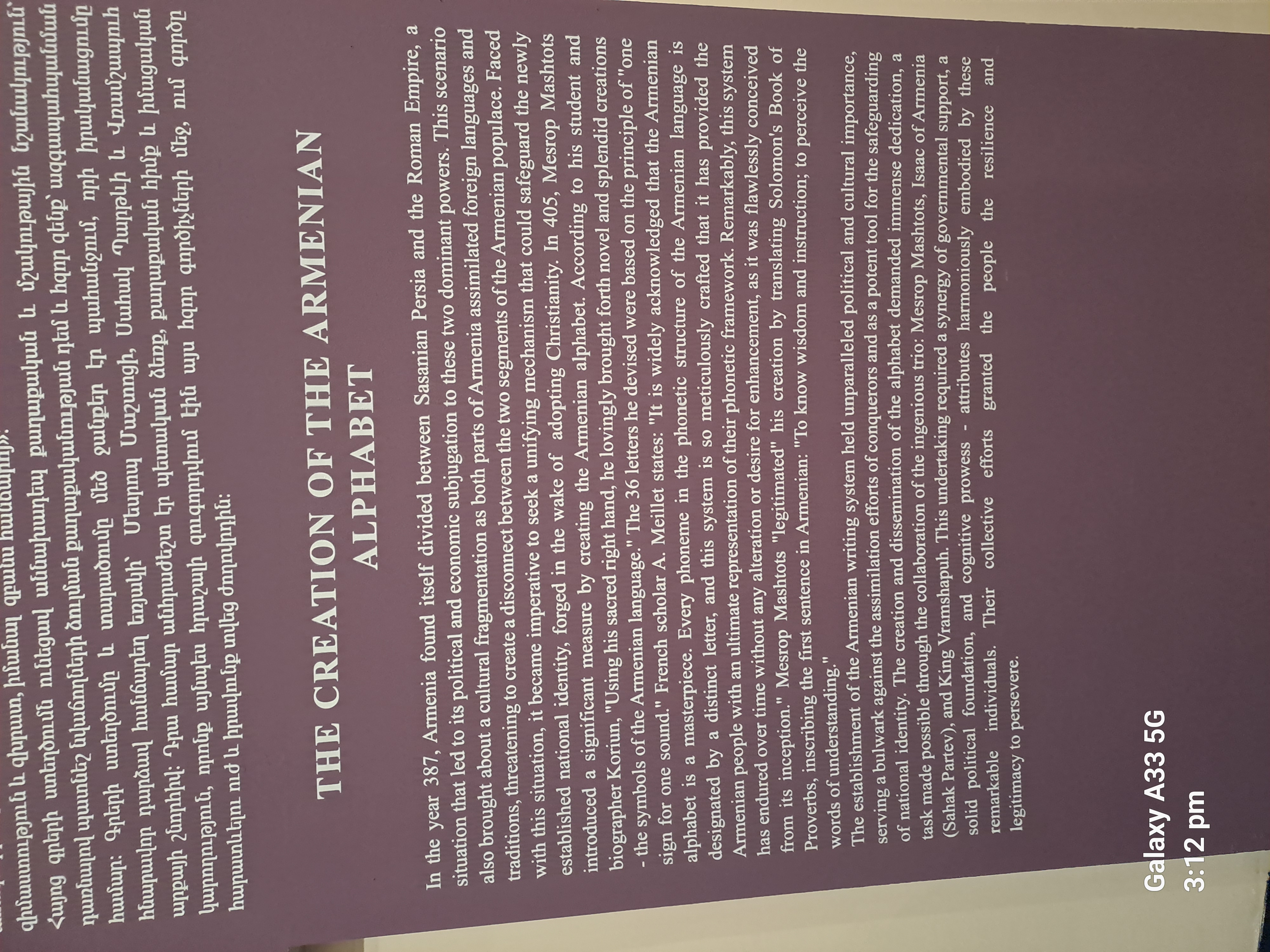 Christianity is seen as one unifying factor in the identity of Armenia. Another was the introduction of the alphabet. This was 86 years later when Armenia was split between two empires, with incentives for people to adopt thr language Mesrop Mashtots created this alphabet.