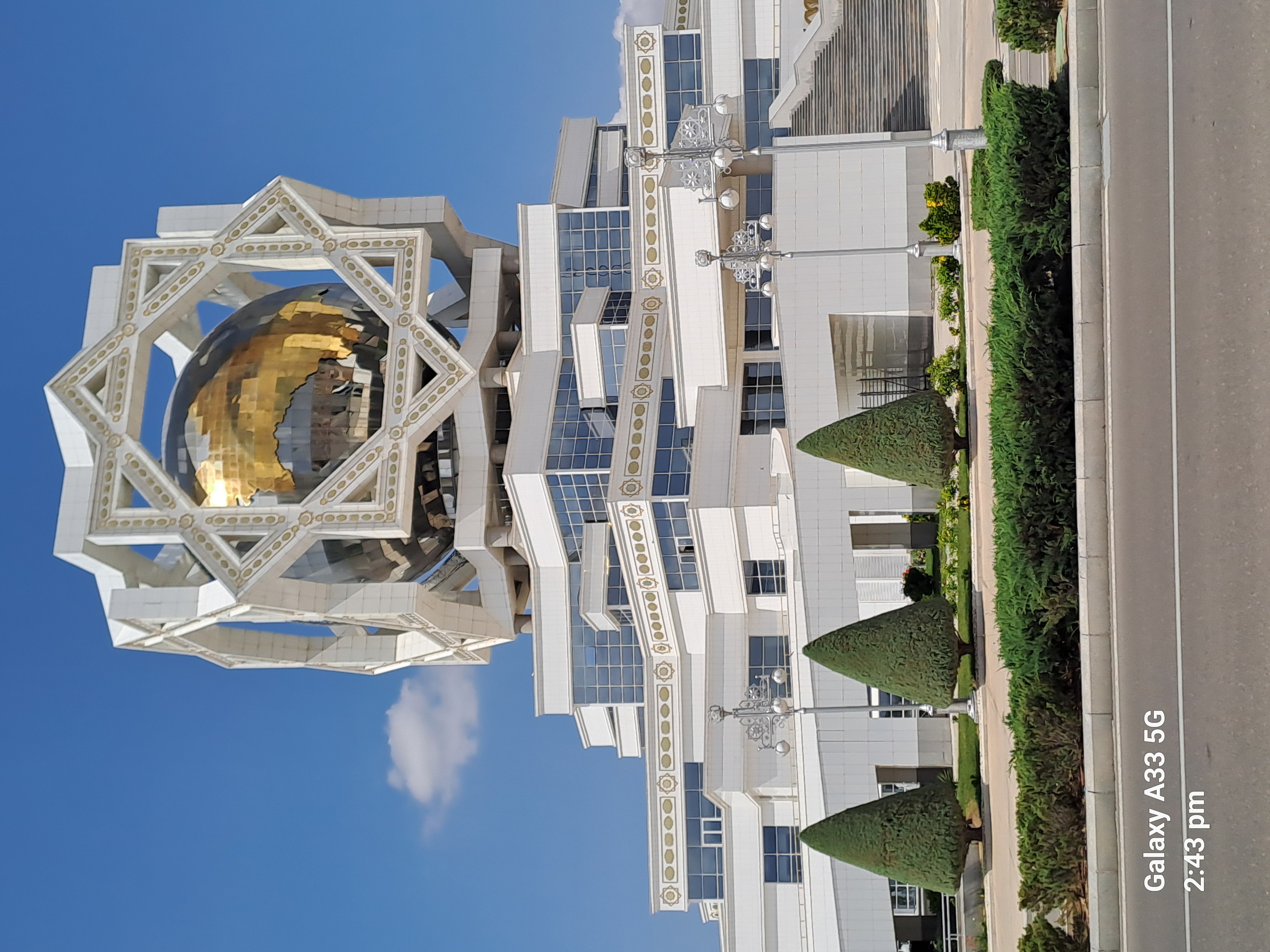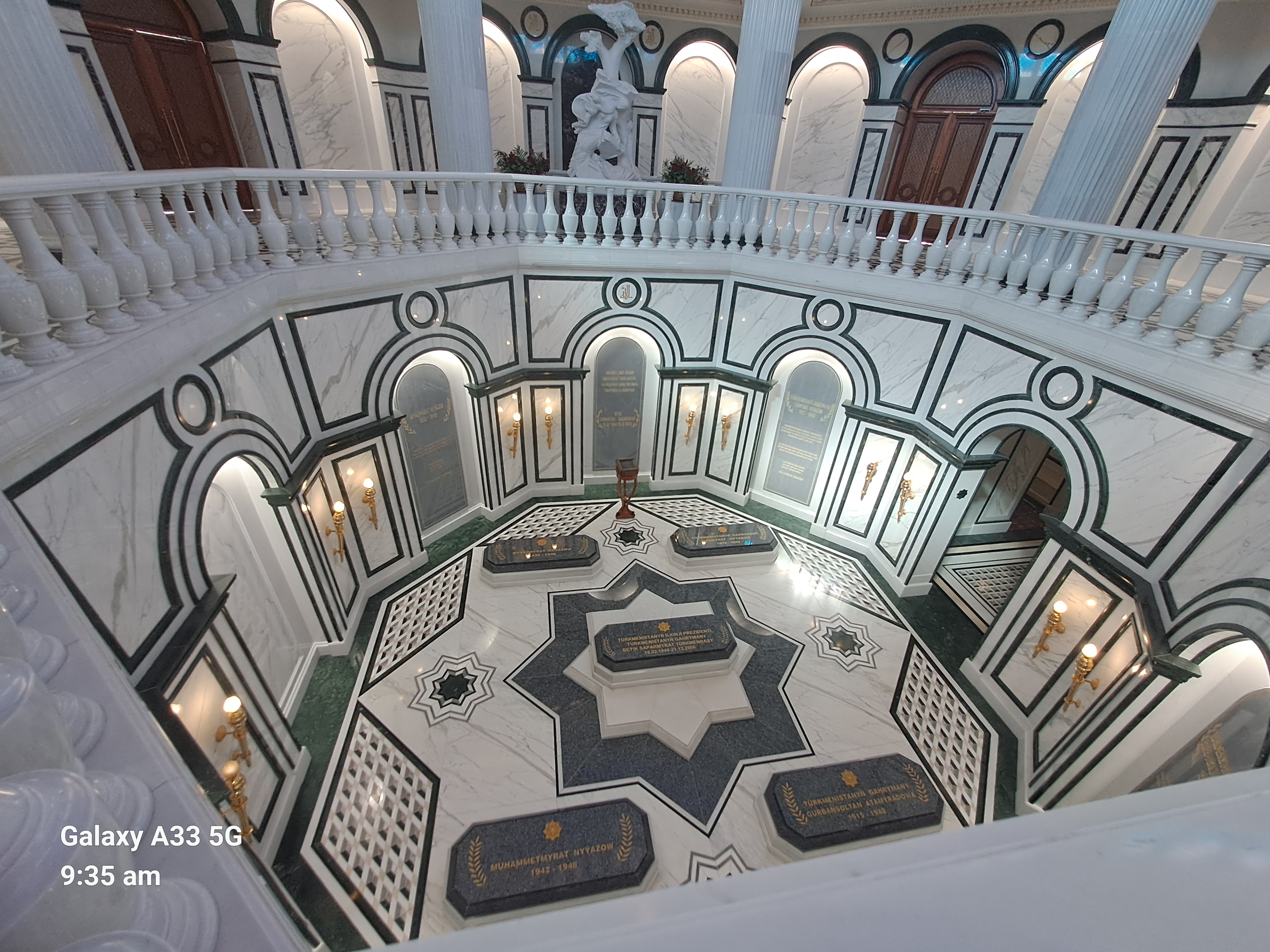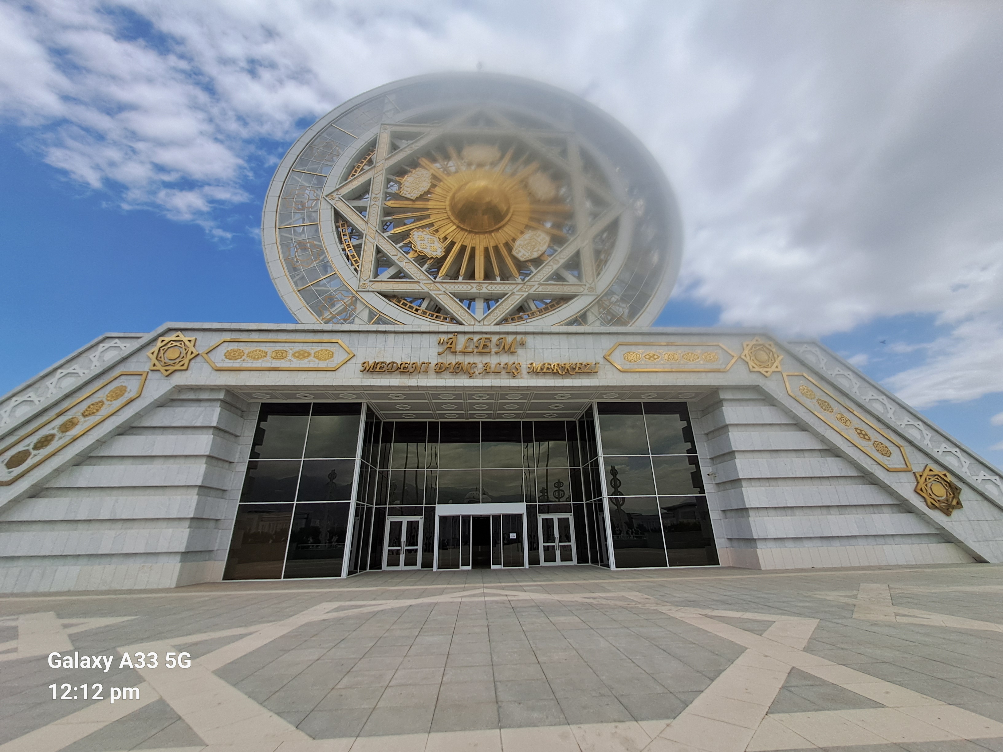 It has 48 windows for the 1948 earthquake. Sometimes there are 100,000 people inside and another 100,000 outside. The carpet is one of the biggest in the world but not the biggest, that is in a museum. The pattern in the star carpet represents the five main tribes and provinces. The eight point star is the official symbol of Turkmenistan. The horse is also a symbol and frequently given as state presents.