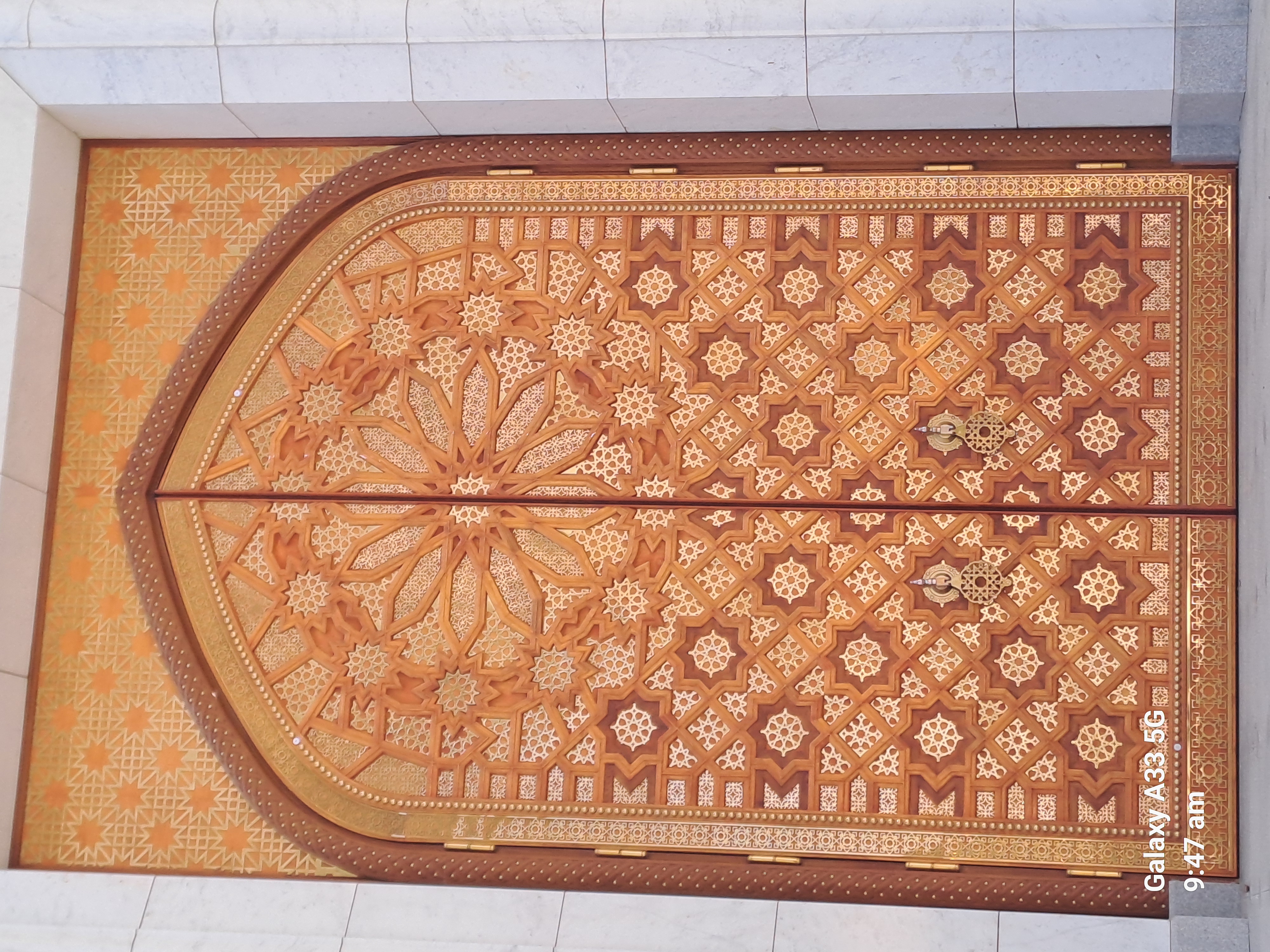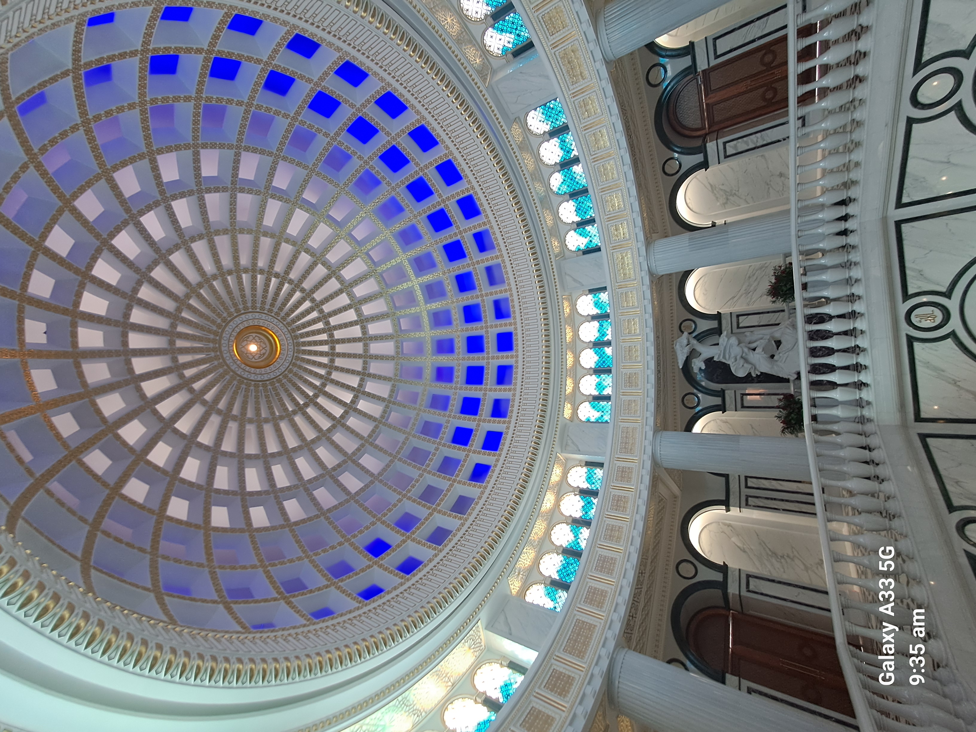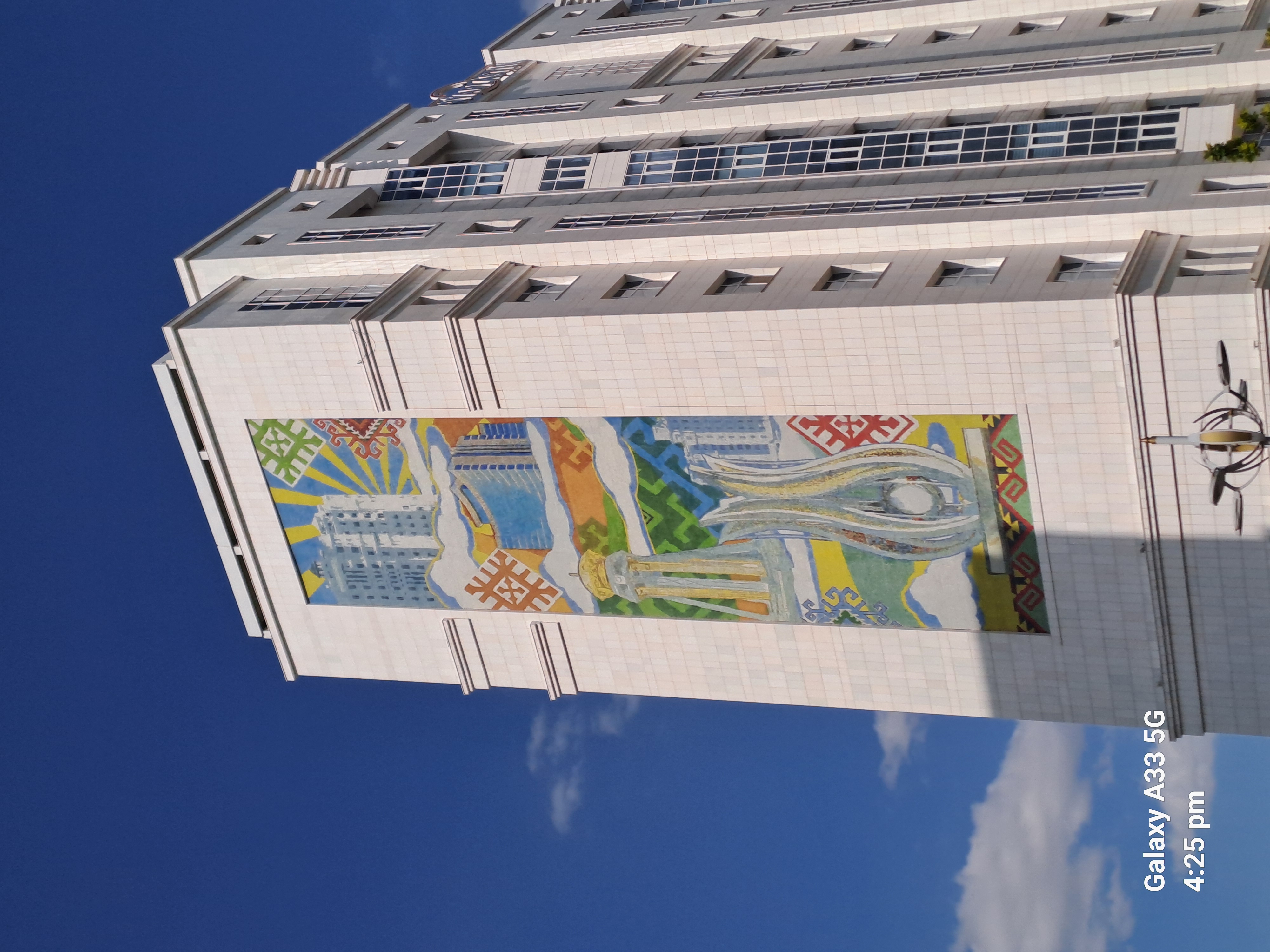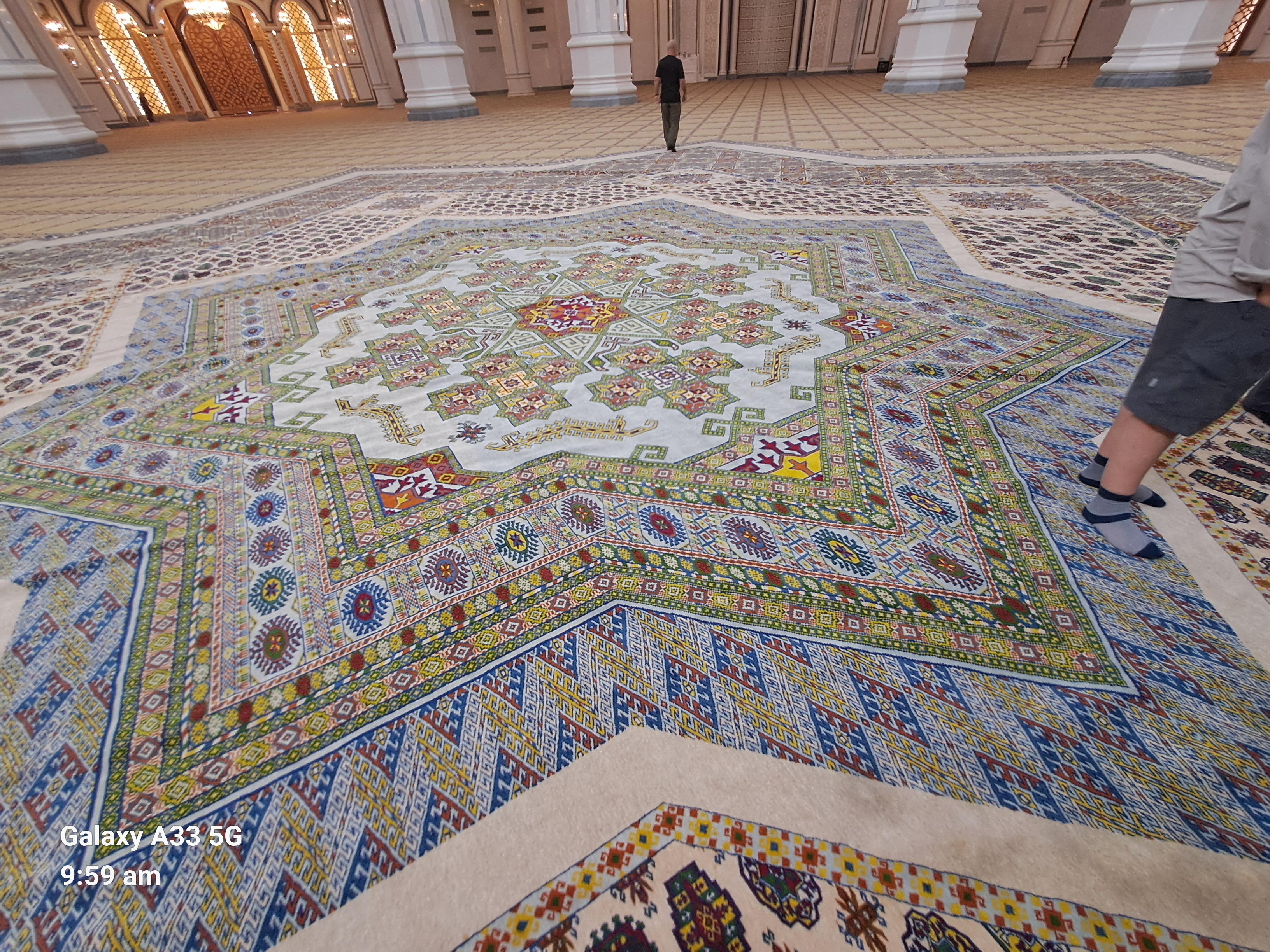 It has 48 windows for the 1948 earthquake. Sometimes there are 100,000 people inside and another 100,000 outside. The carpet is one of the biggest in the world but not the biggest, that is in a museum. The pattern in the star carpet represents the five main tribes and provinces. The eight point star is the official symbol of Turkmenistan. The horse is also a symbol and frequently given as state presents.