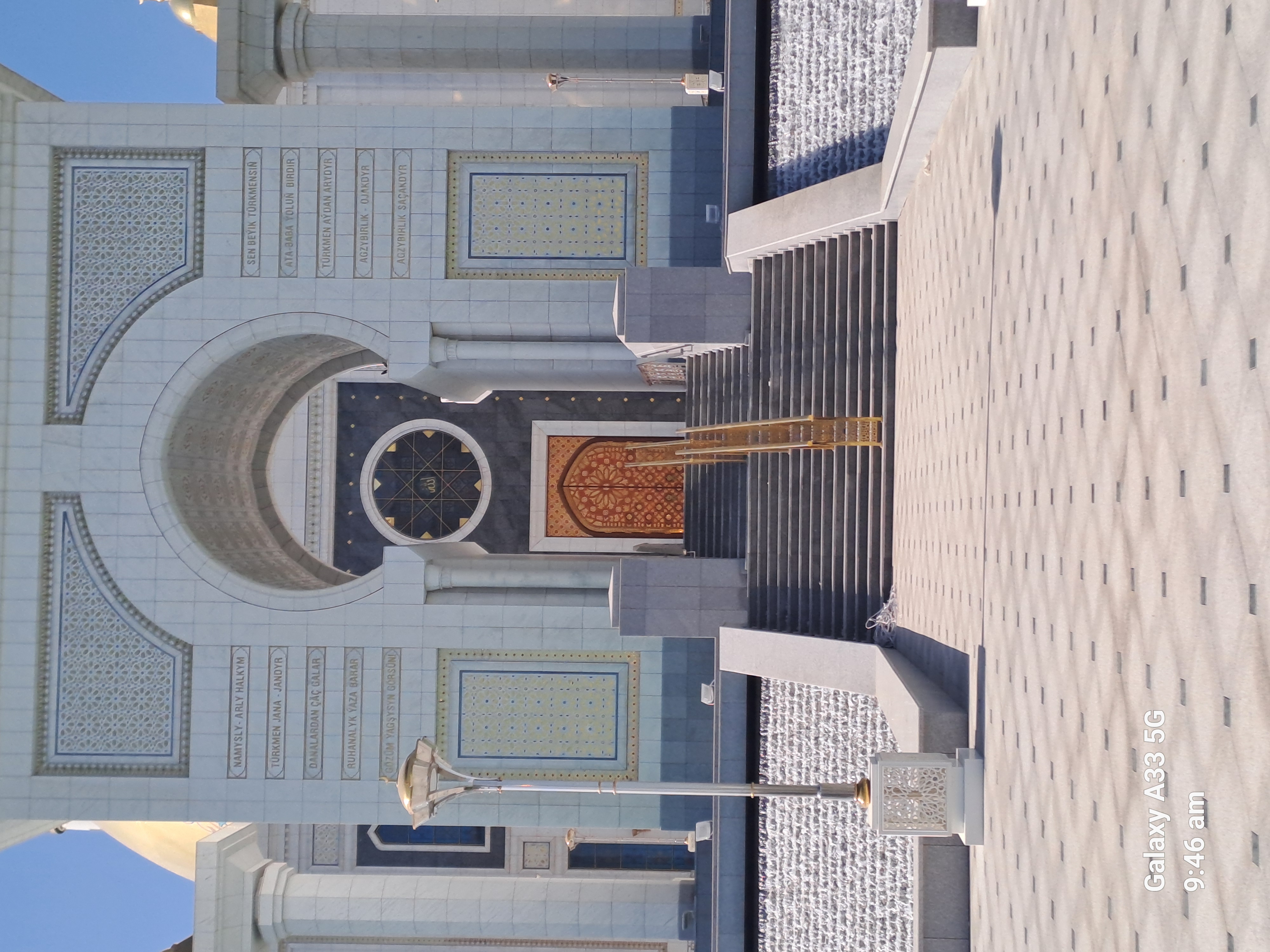 The mosque next door unusually has writing built in that isn’t in Arabic. These are texts from the president’s book.