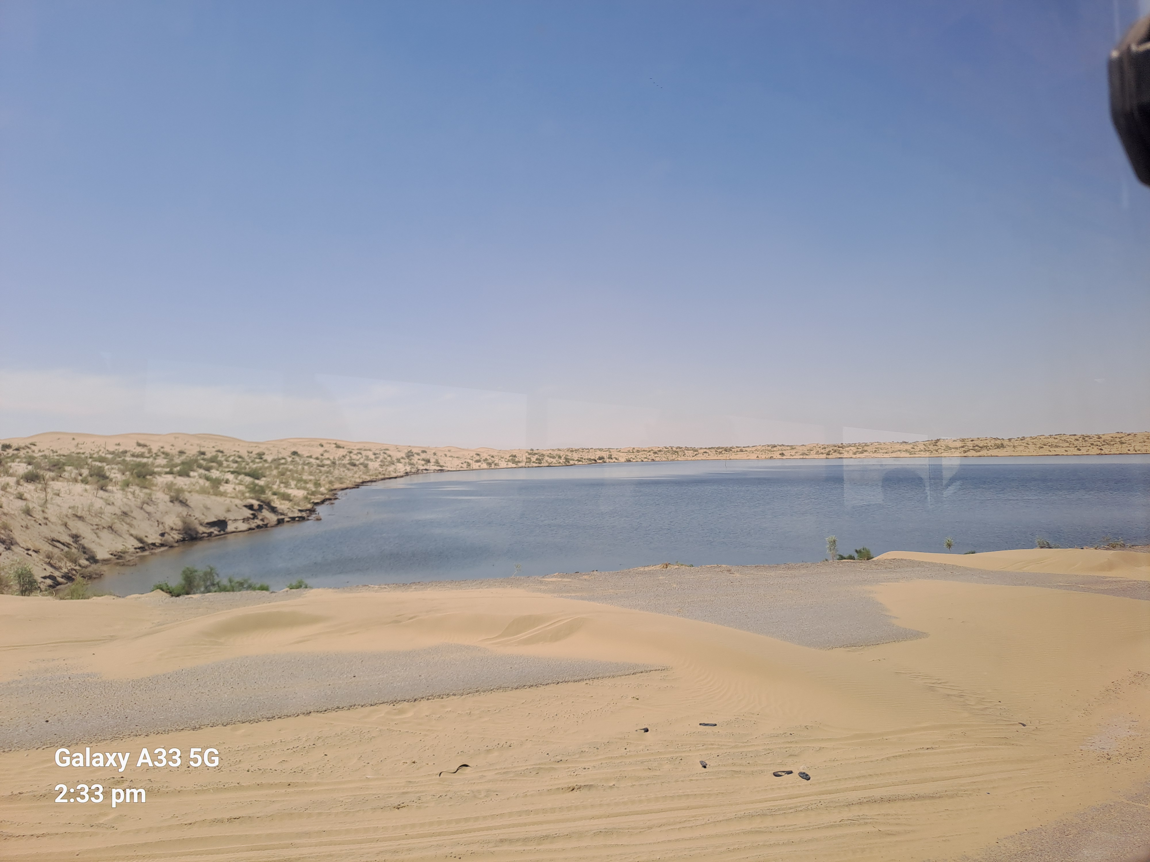 After we left Ashgabat we saw a very different view of the country. It is mainly desert and the long road that we followed through to the border was in very poor repair. Progress was very slow with the truck zigzagging from side to side to avoid potholes and also swapping carriageway – maybe over rating the road here.. One road was the original soviet potholed track and the other often at a different level more like a mud track. What was already a long drive day became a few hours longer and we finally arrived at the gas crater just about sunset.